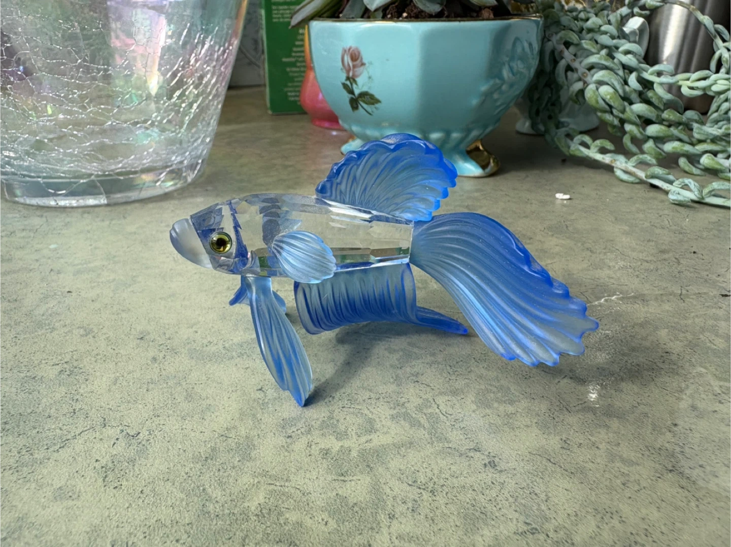 Here's a lovely crystal betta fish figurine! It's a beautiful piece that would look great in any home. The fish is a nice shade of blue and clear, and it catches the light beautifully. It's in excellent condition, ready to find a new home. I do not have the original box