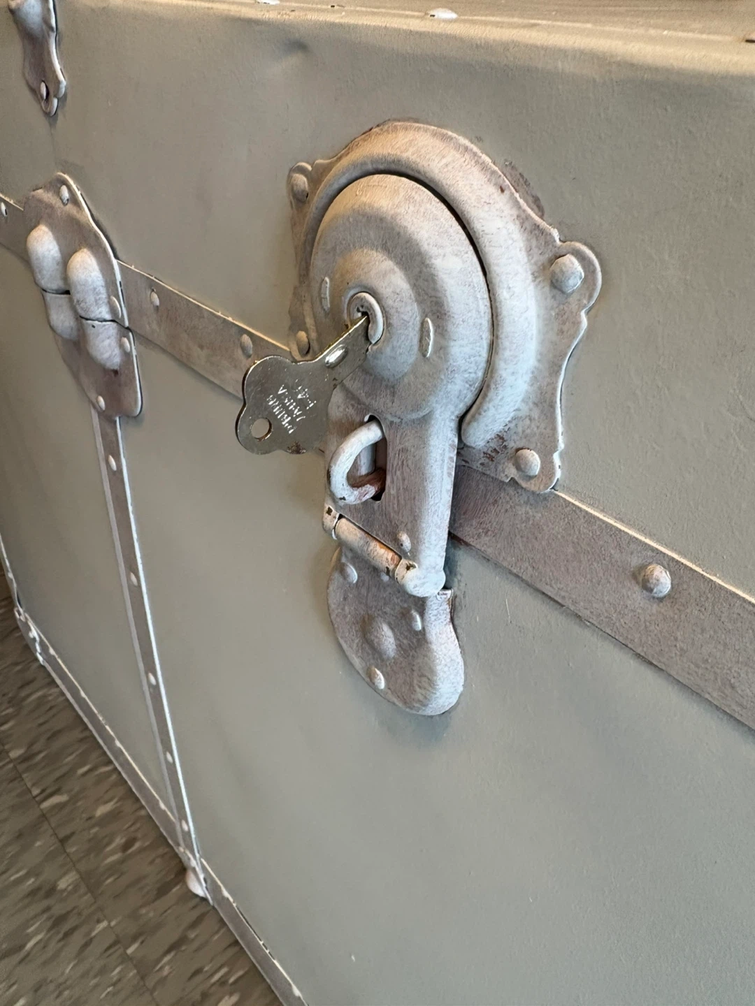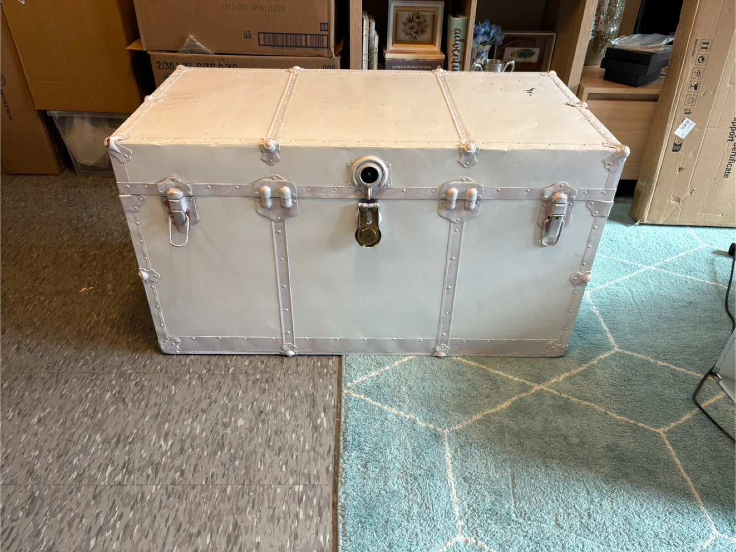 Selling a vintage steamer trunk. It's in good condition for its age. Perfect for storage or as a decorative piece!