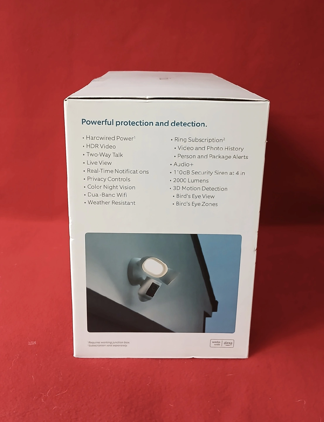 It offers powerful protection and detection with features like a hardwired power source, ring subscription, video and photo history, person and package alerts, a 110dB security siren, 2000 lumens, and bird's eye view and zones.