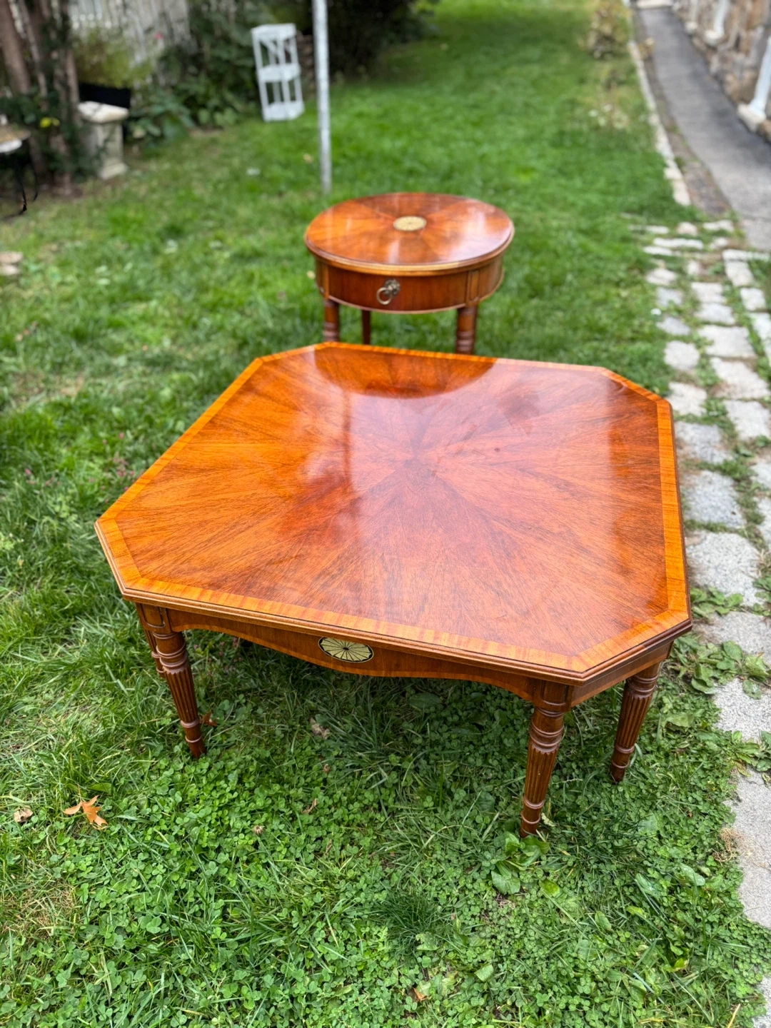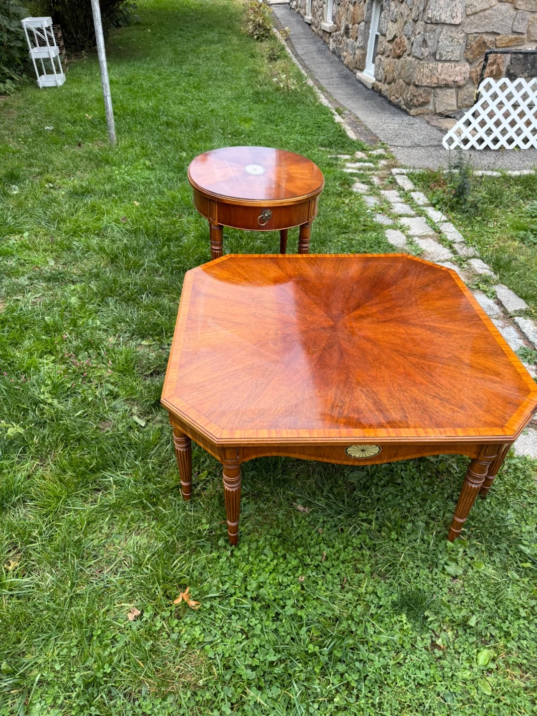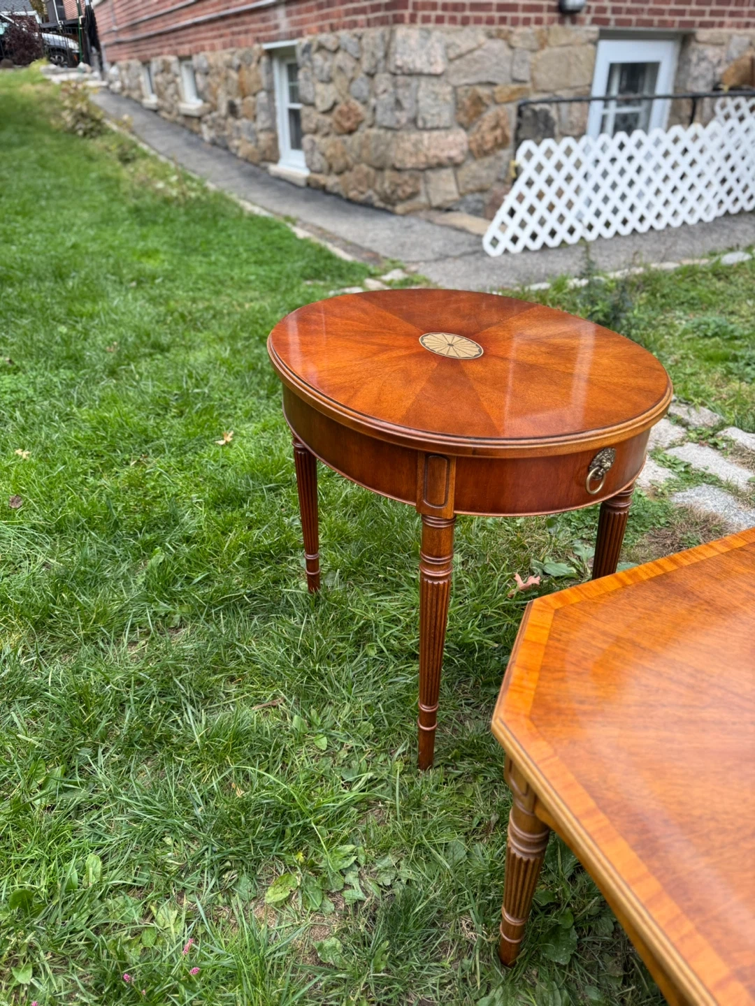 Selling a set of two wooden end tables. They're in good condition and would look great in any living room or bedroom. The set includes one oval-shaped table and one octagonal-shaped table. Perfect for adding a touch of elegance to your home!