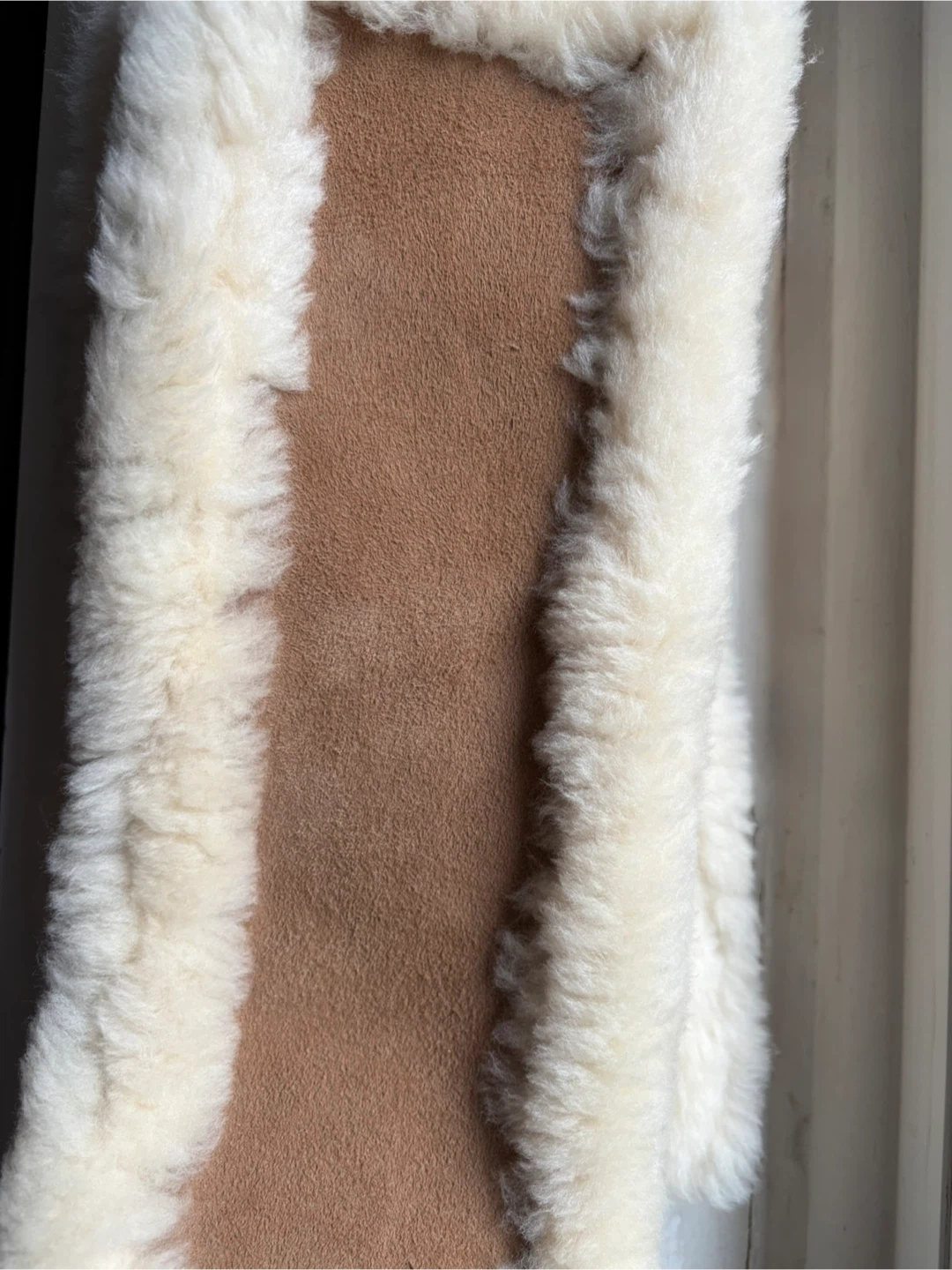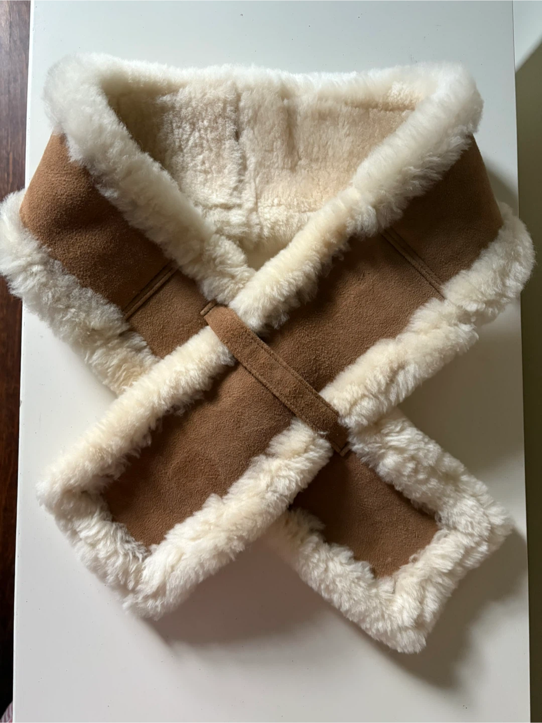 Made of authentic sheepskin, it features a plush cream wool interior and soft tan suede exterior, with a classic crossover design that wraps you in warmth and understated elegance.
