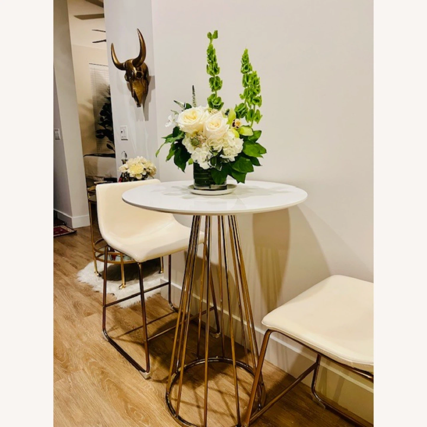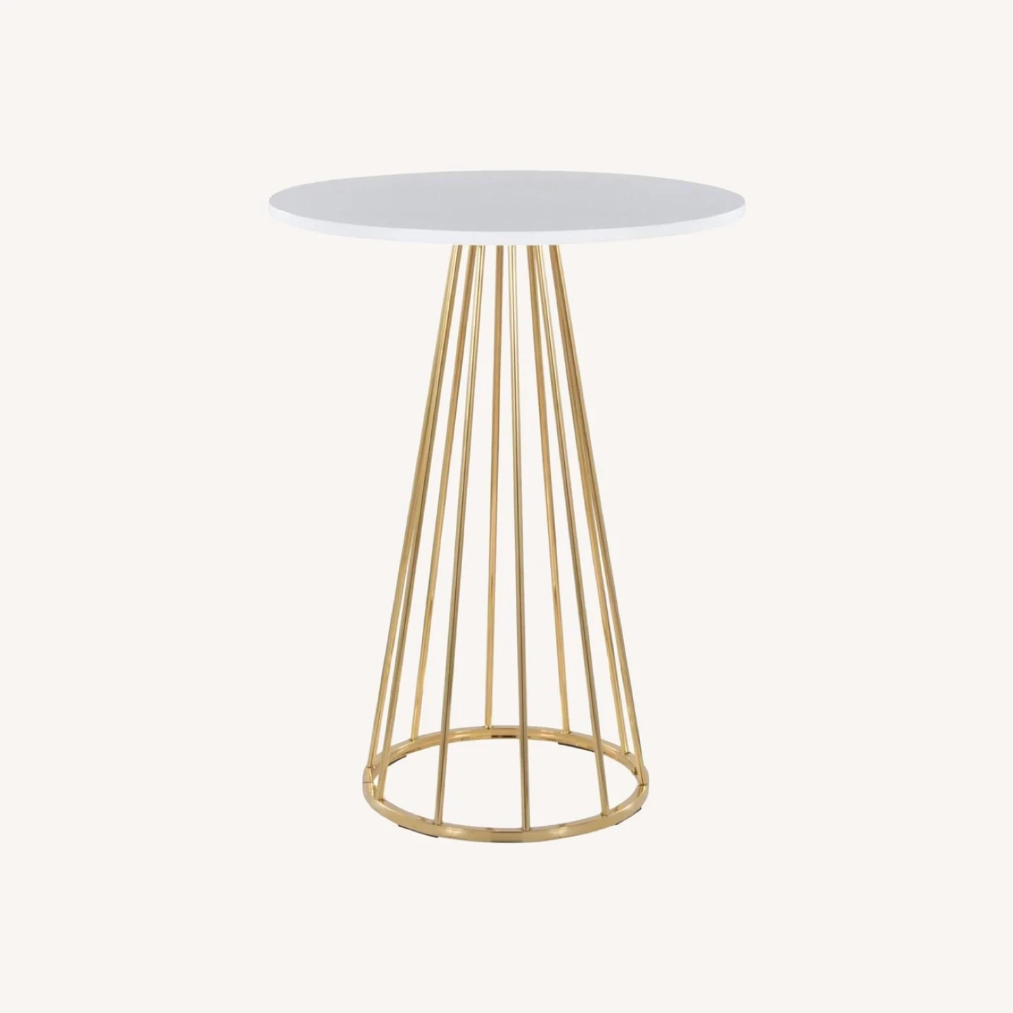 Opulent and confidently contemporary - that's the Canary Counter Table by LumiSource. Featuring a captivating cage-like metal base with an elegant table top, this table will add a bold touch of glamour to your dining area. Available in a variety of materials and finishes, choose the one that fits your space best. Beautiful contemporary/glam styling Fixed counter height Round wood top Sleek gold frame finish Seats two comfortably Great for use in dining room, kitchen, break room Indoor use only ** slight discoloration on top white surface; gold metal is in perfect condition **