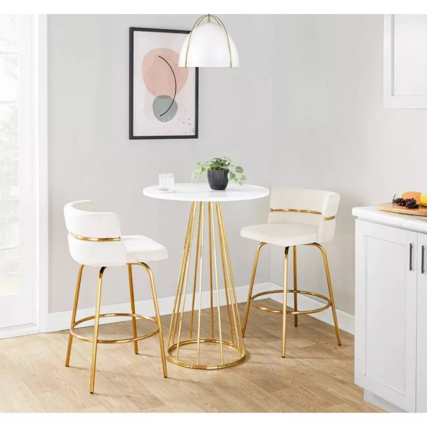 Beautiful contemporary/glam styling Fixed counter height Round wood top Sleek gold frame finish Seats two comfortably Great for use in dining room, kitchen, break room Indoor use only