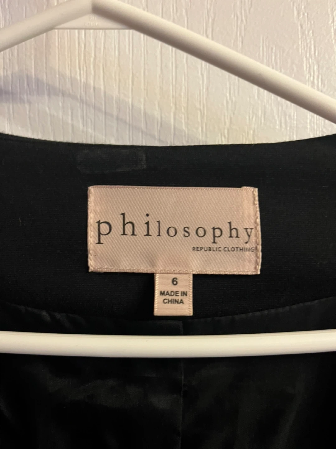 Selling a Philosophy Republic Clothing black blazer in size 6. Great condition. Features include a stylish design and comfortable fit, perfect for dressing up or down. Pet and smoke free home. Pick up in Stittsville.