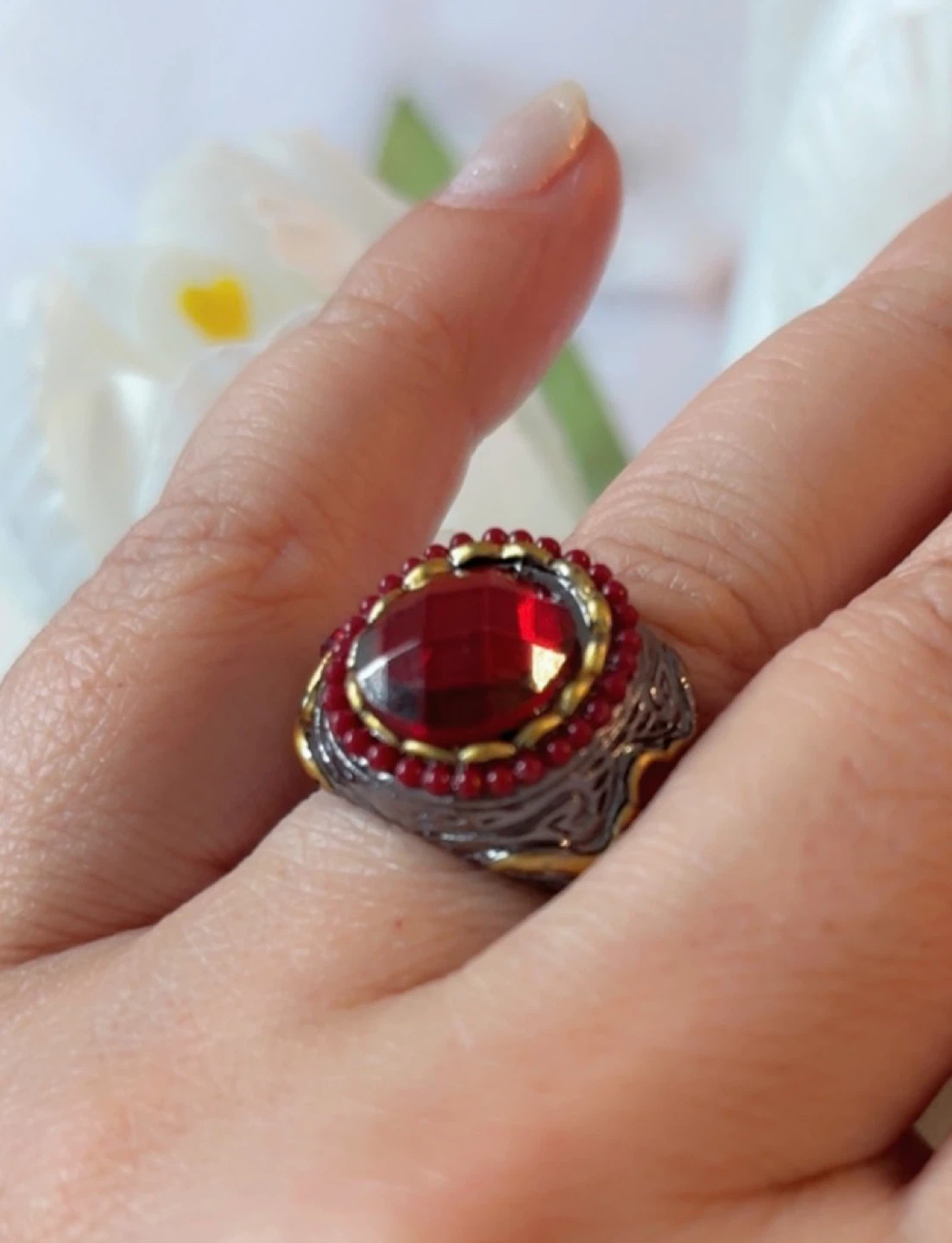 Gorgeous ring with a large red gemstone. The band has intricate detailing with gold accents and smaller red beads surrounding the main stone.