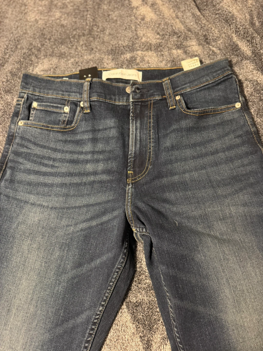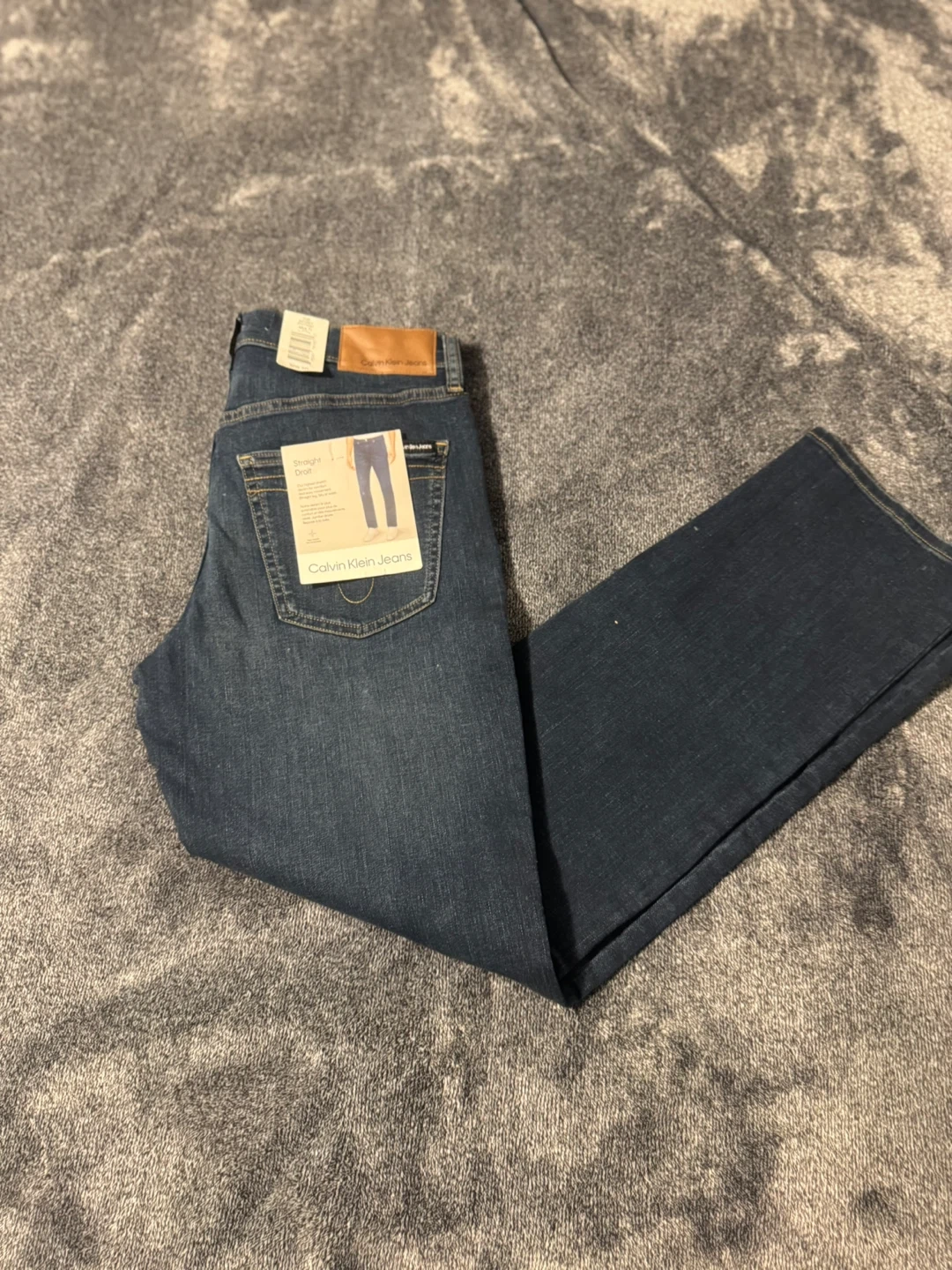 Selling a pair of Calvin Klein jeans in size 32W 32L. These are straight fit jeans, great for everyday wear! They're a comfortable denim with a straight leg that sits at the waist