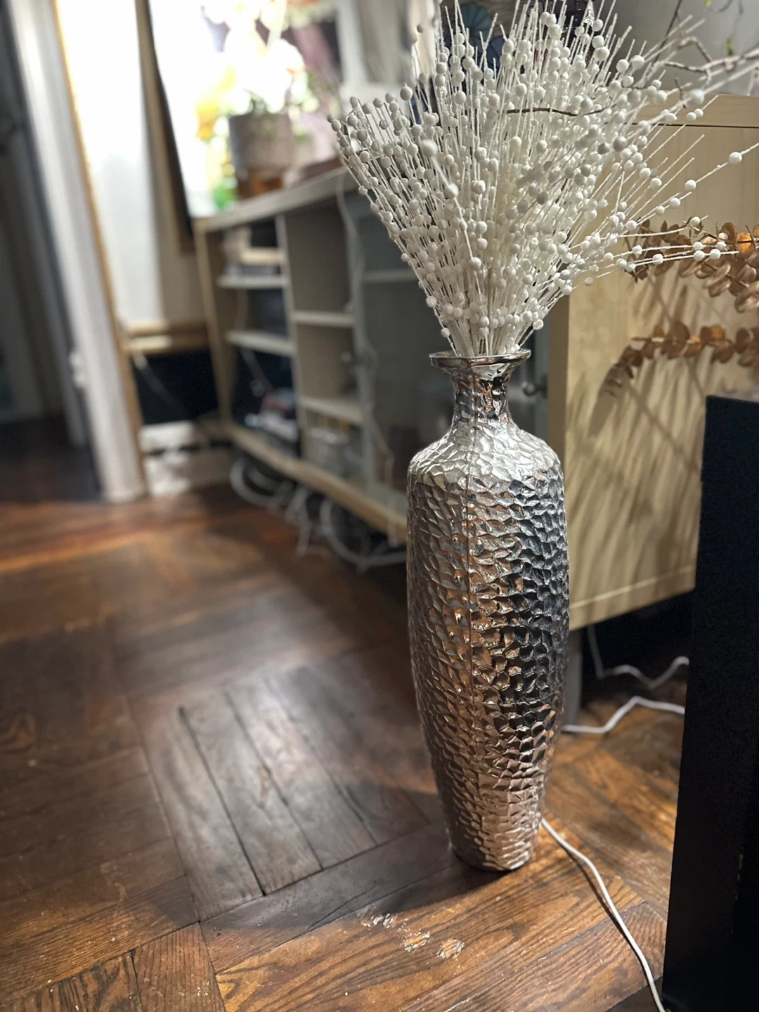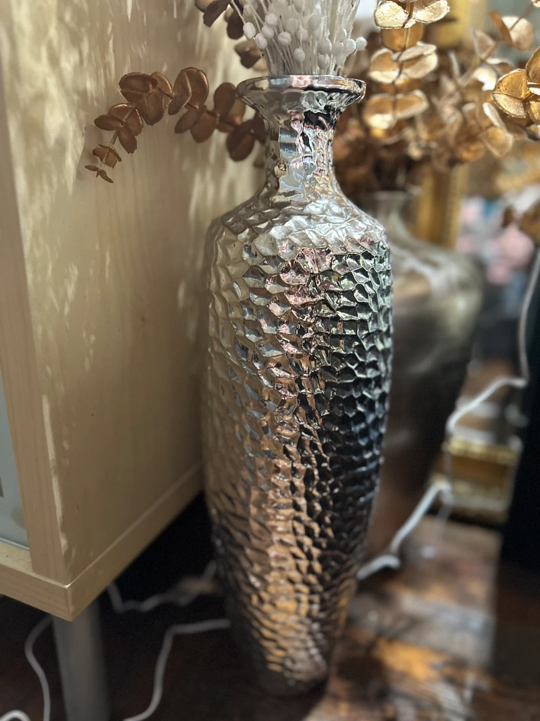 Selling a beautiful silver decorative vase. It has a unique embossed textured design that catches the light nicely. It would be an elegant addition to any room!