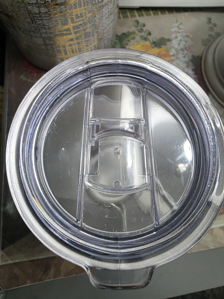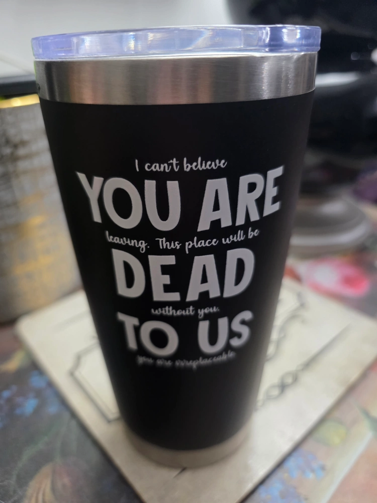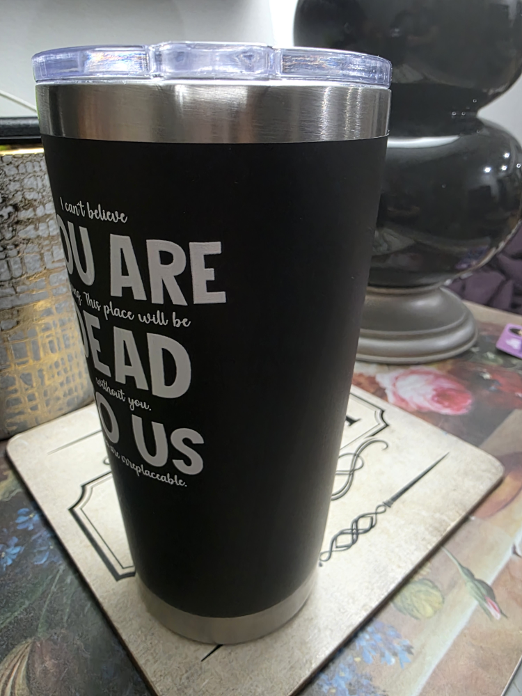 Selling a black insulated tumbler. It has a clear lid and stainless steel accents. The tumbler has a funny quote on it!