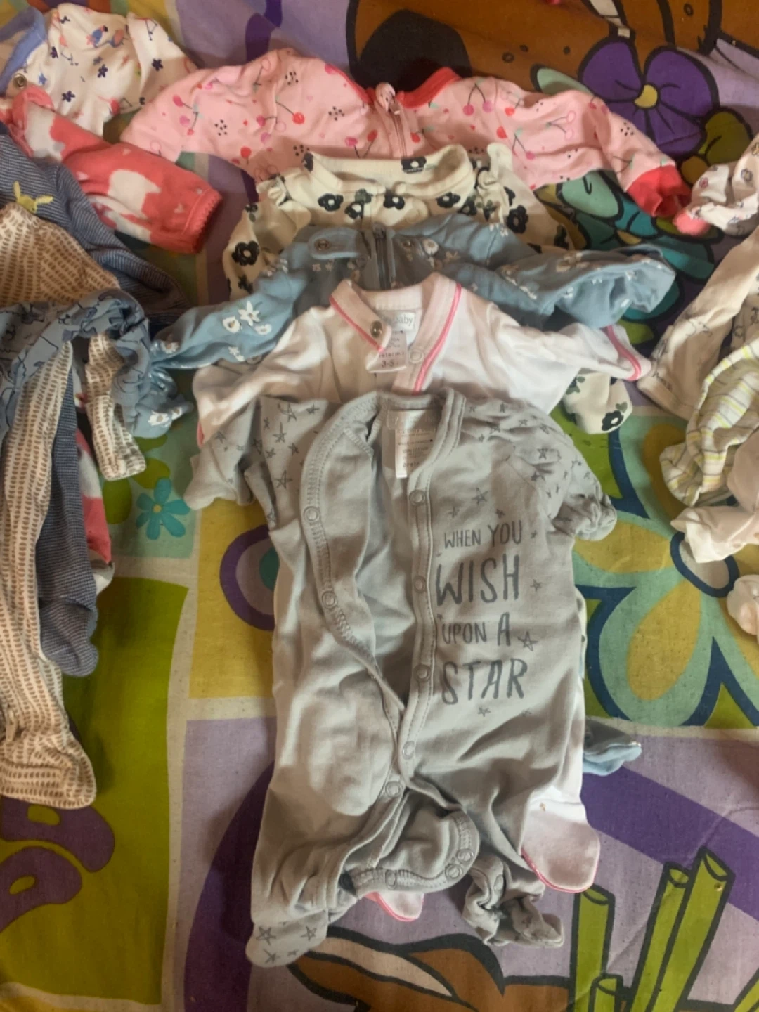 A collection of adorable BRAND NEW PREEMIE baby onesies and hats, perfect for keeping your little one comfy and cozy! The onesies come in various colours and patterns, and the hats are soft and warm. Great for premature newborns!
