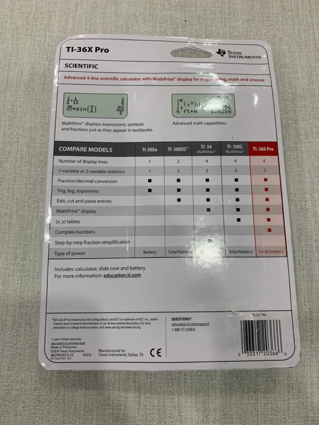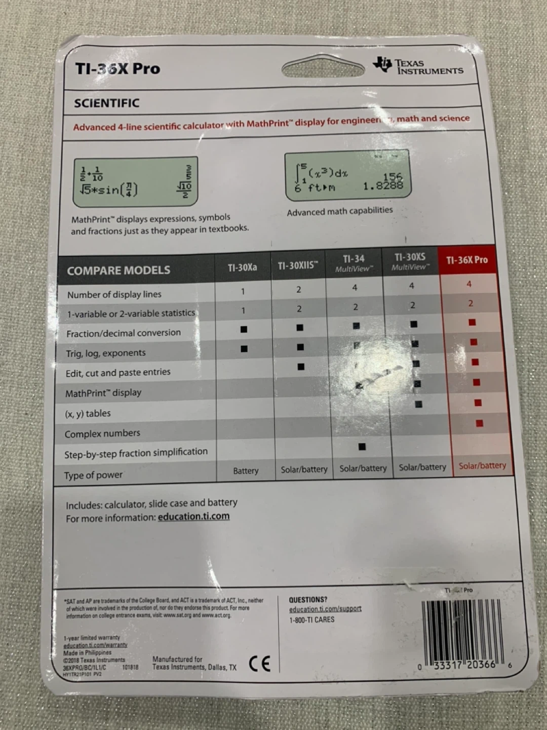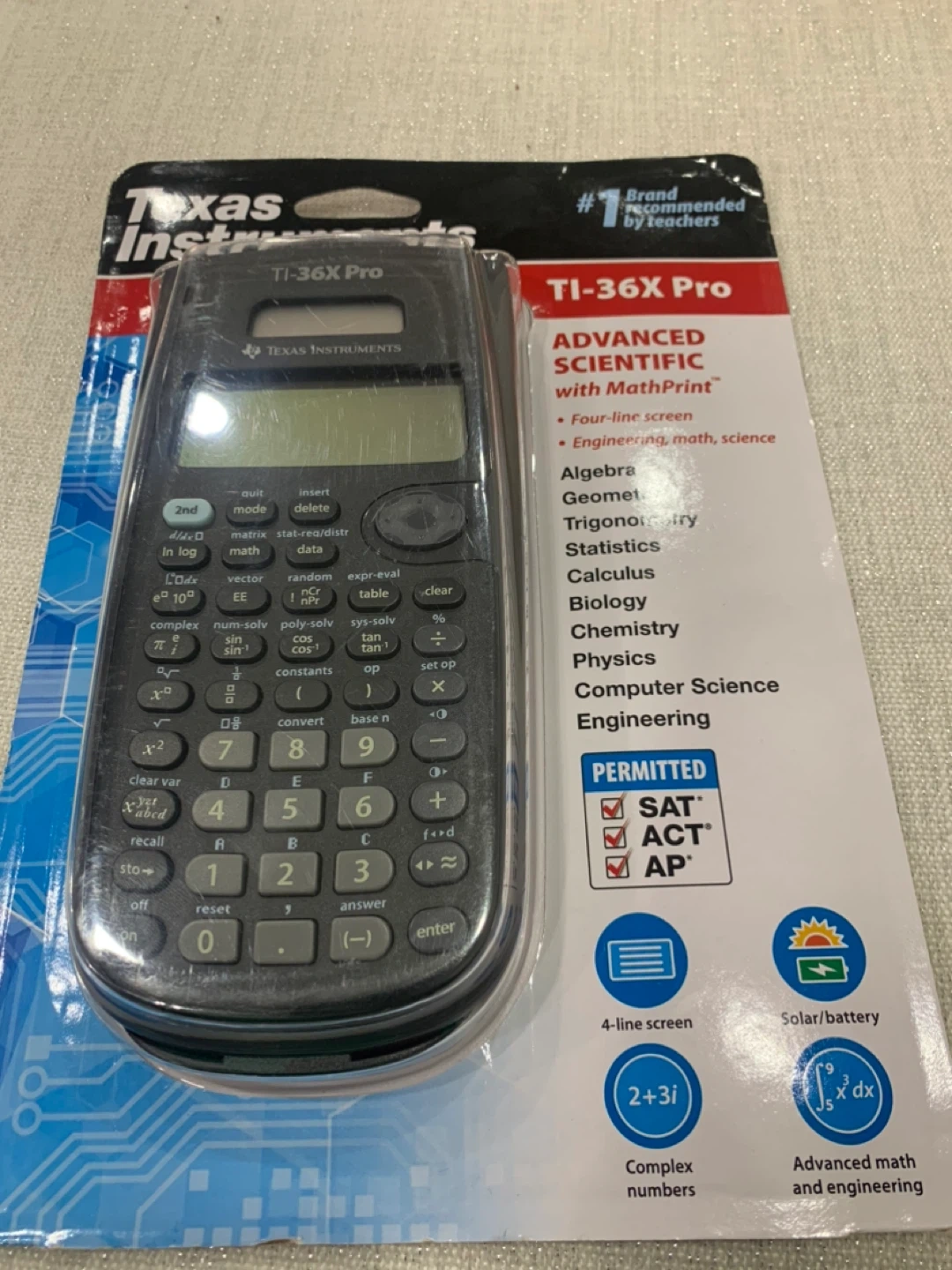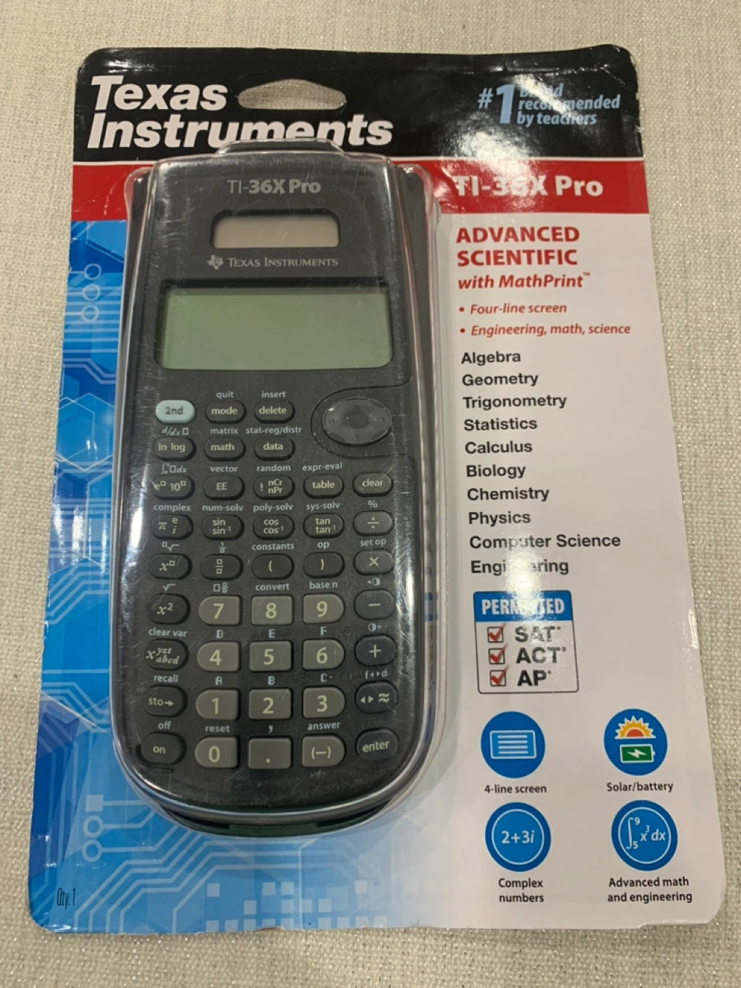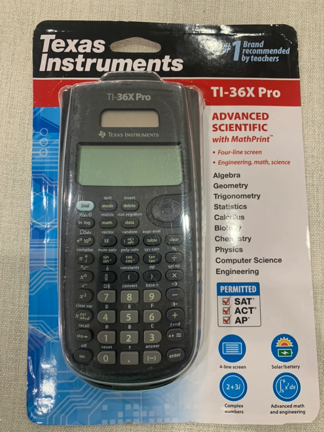 Selling a Texas Instruments TI-36X Pro calculator! It's an advanced scientific calculator with MathPrint display, perfect for engineering, math, and science courses. It has a four-line screen and is permitted for SAT, ACT, and AP exams. It's solar and battery powered!