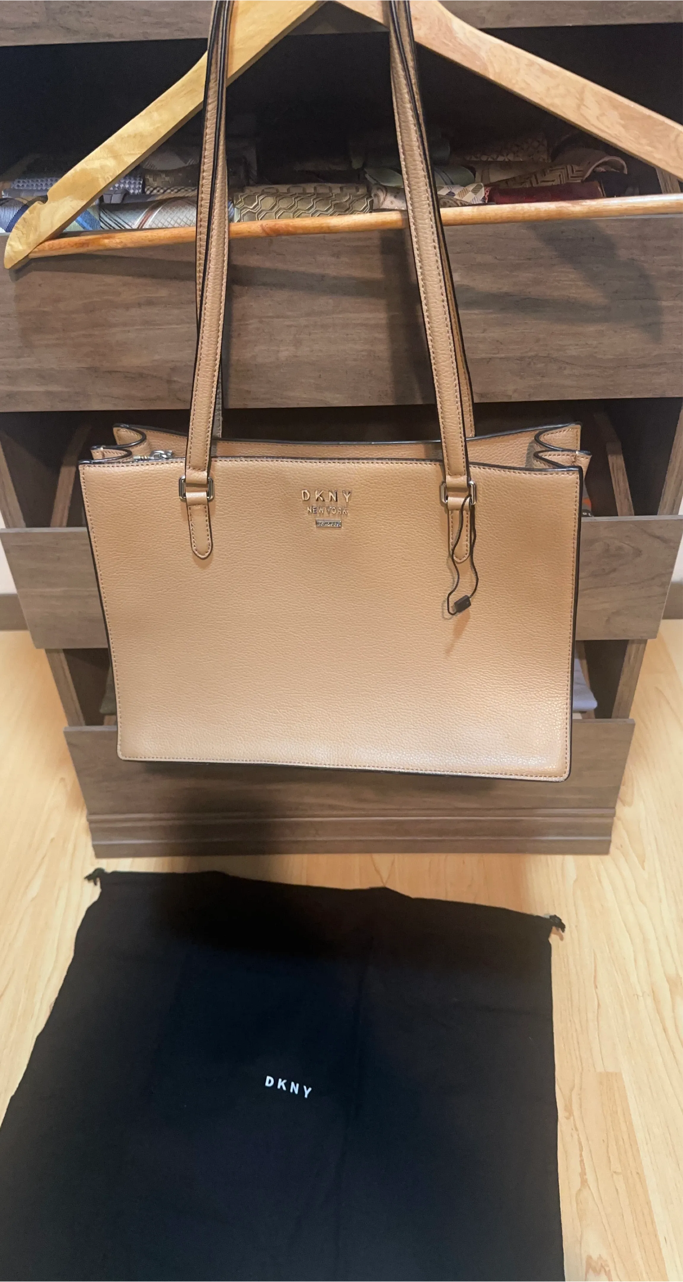 This is a DKNY tote bag in a beige color. It comes with its original dust bag for storage. It's a stylish and practical bag for everyday use!100% cow leather.