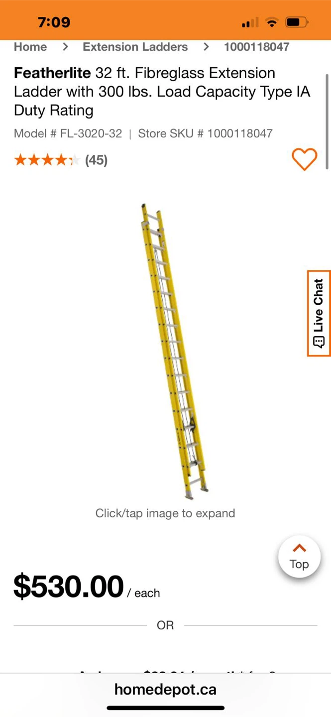 Selling a Featherlite 32 ft. fibreglass extension ladder. It has a 300 lbs load capacity and is Type IA Duty Rated. Model # FL-3020-32. Originally bought for $530 at Home Depot