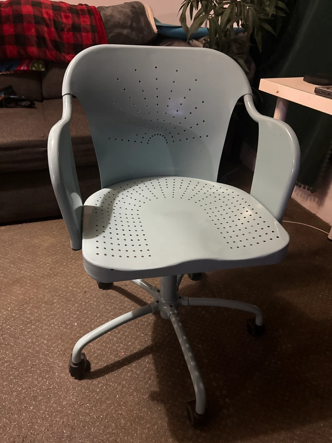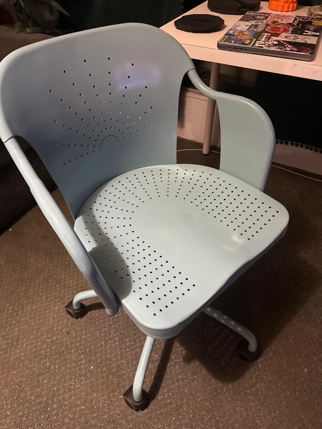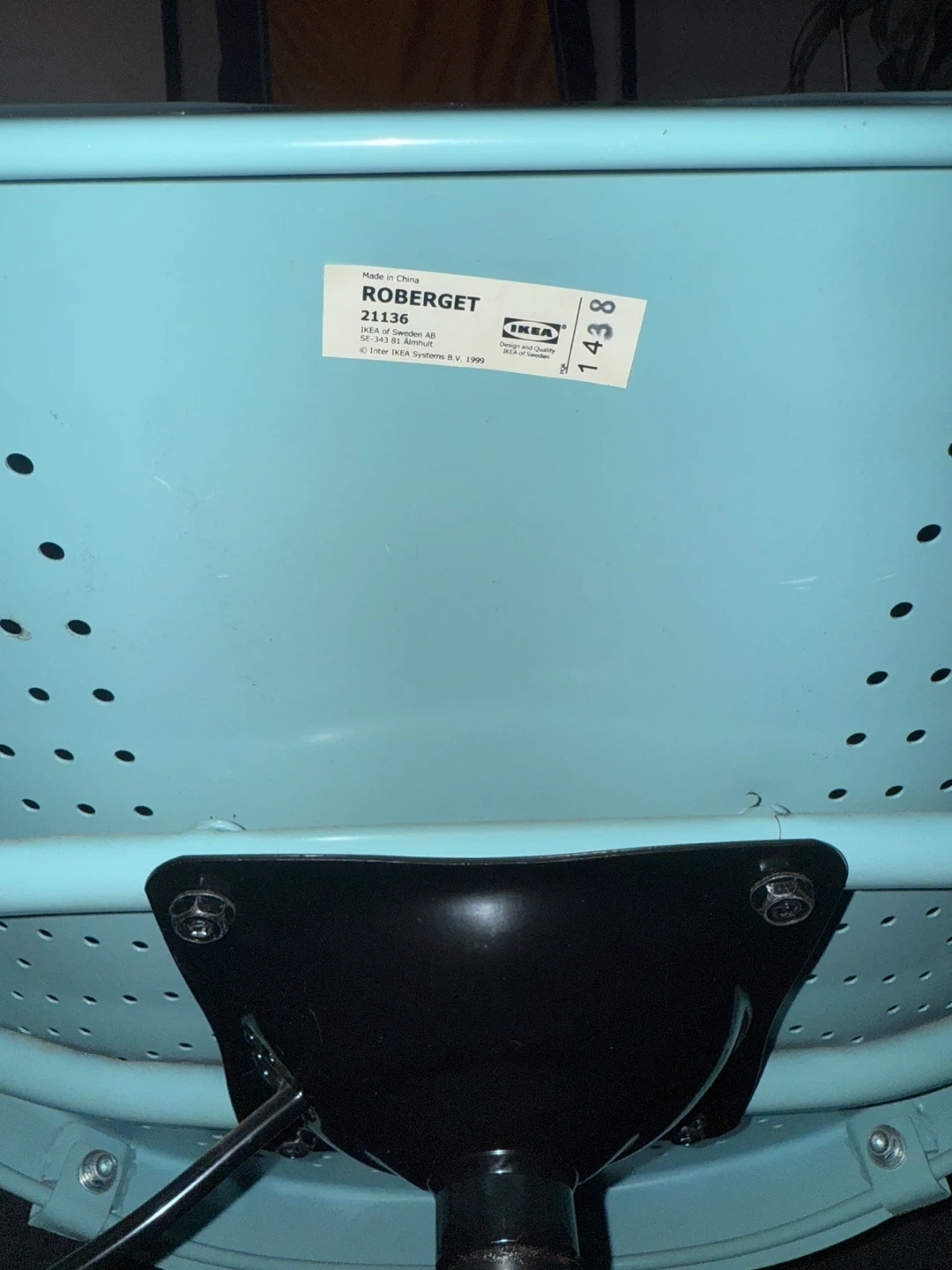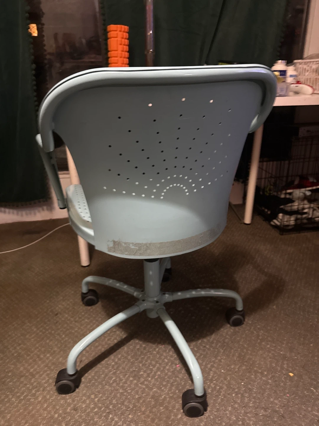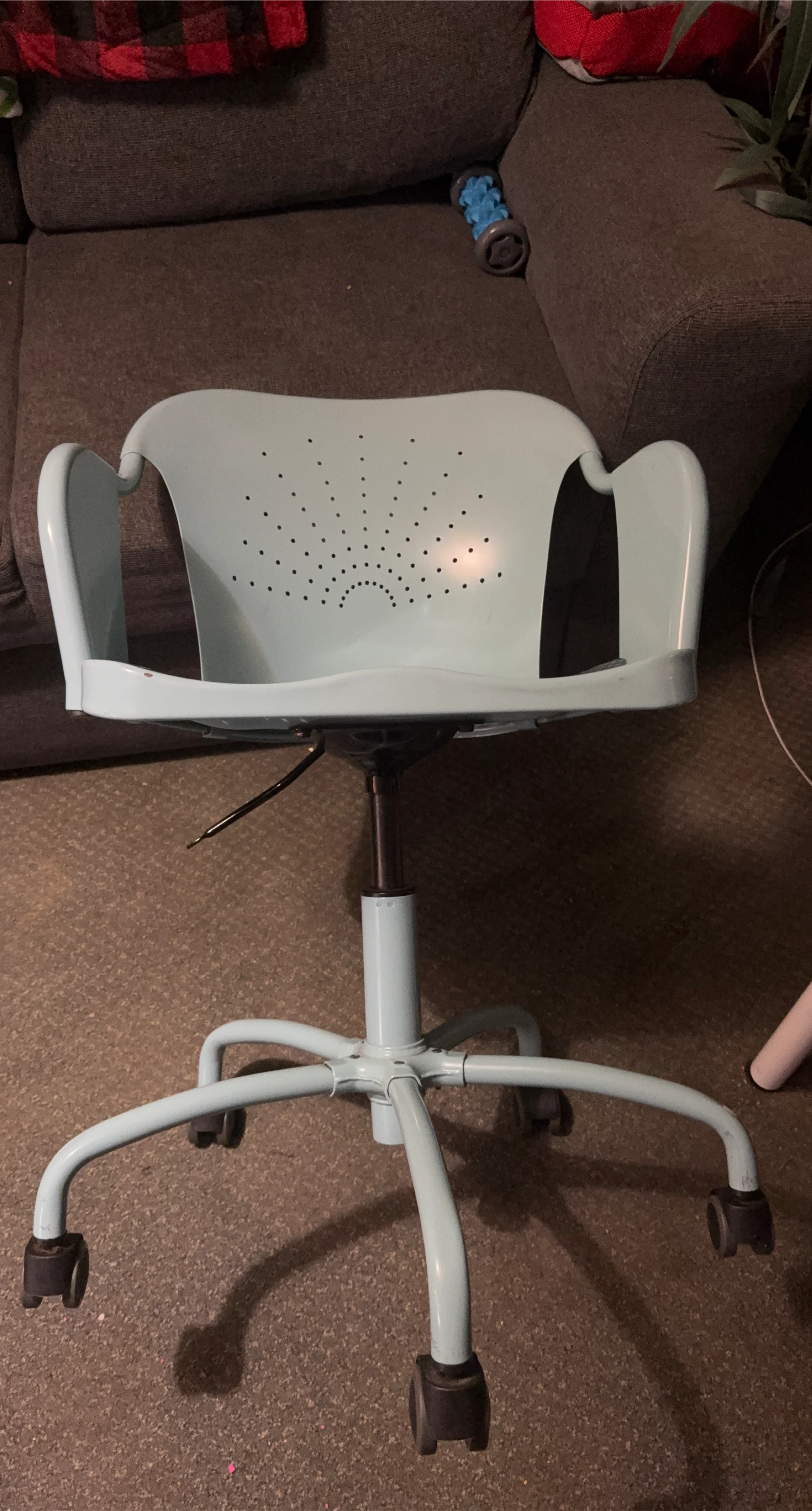 Selling a light turquoise IKEA ROBERGET swivel chair. It's in good condition and ready for a new home! There is some wear on the back of the chair. Perfect for a home office or student space