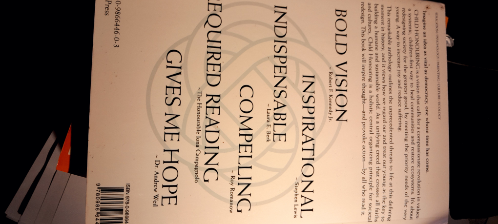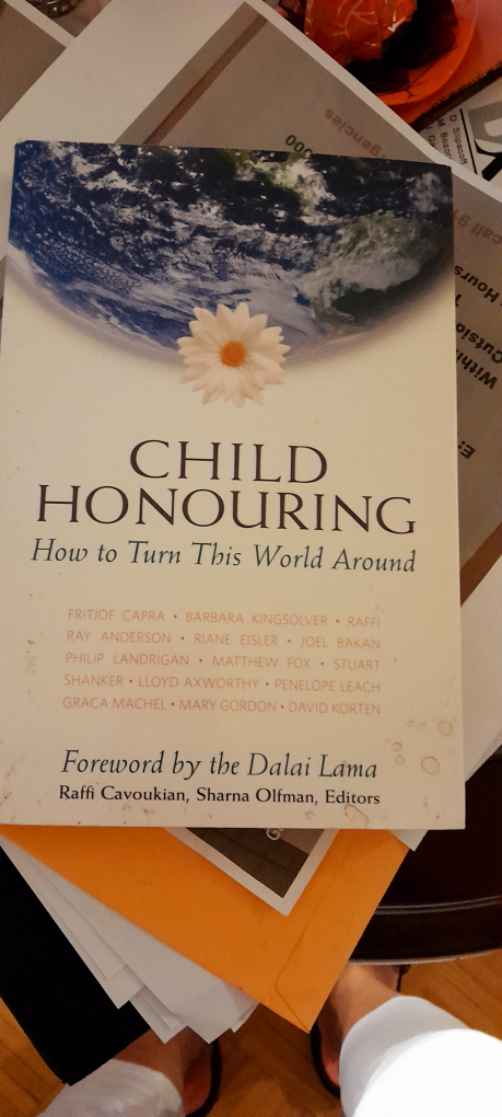 Selling the book Child Honouring: How to Turn This World Around. It is written by Fritjof Capra, Barbara Kingsolver, Raffi, Ray Anderson, Riane Eisler, Joel Bakan, Philip Landrigan, Matthew Fox, Stuart Shanker, Lloyd Axworthy, Penelope Leach, Graca Machel, Mary Gordon, and David Korten. The foreword is written by the Dalai Lama, Raffi Cavoukian, and Sharna Olfman, Editors. It's a compelling read!