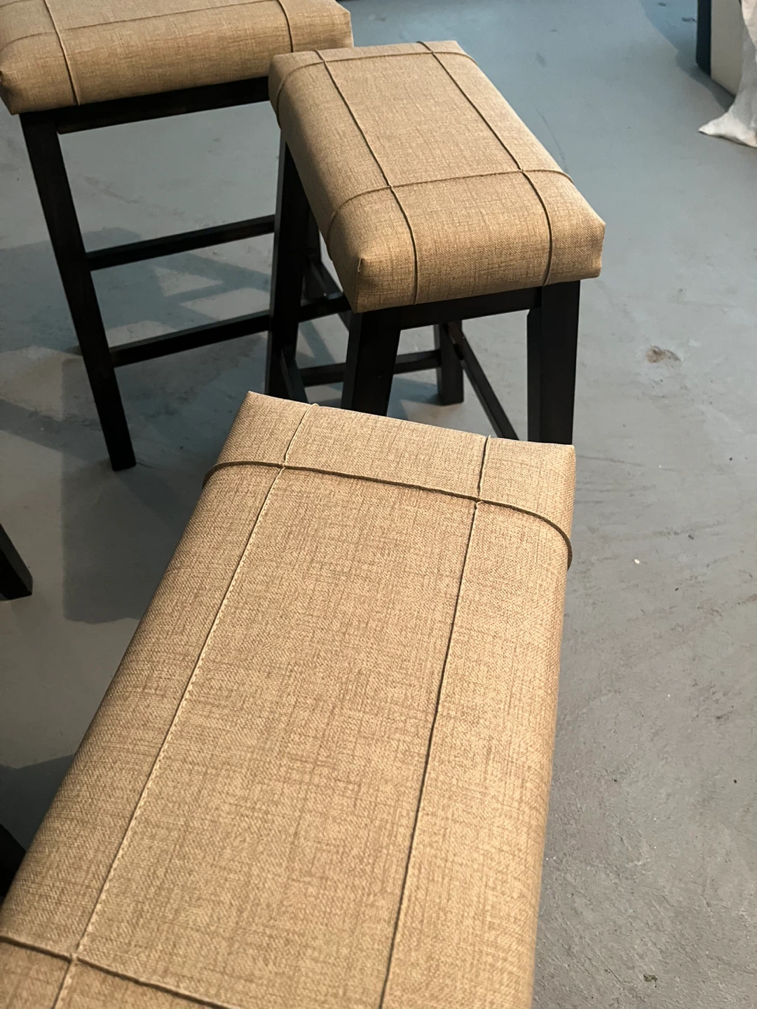 The stools have a light beige upholstered seat, perfect for a kitchen or bar area!