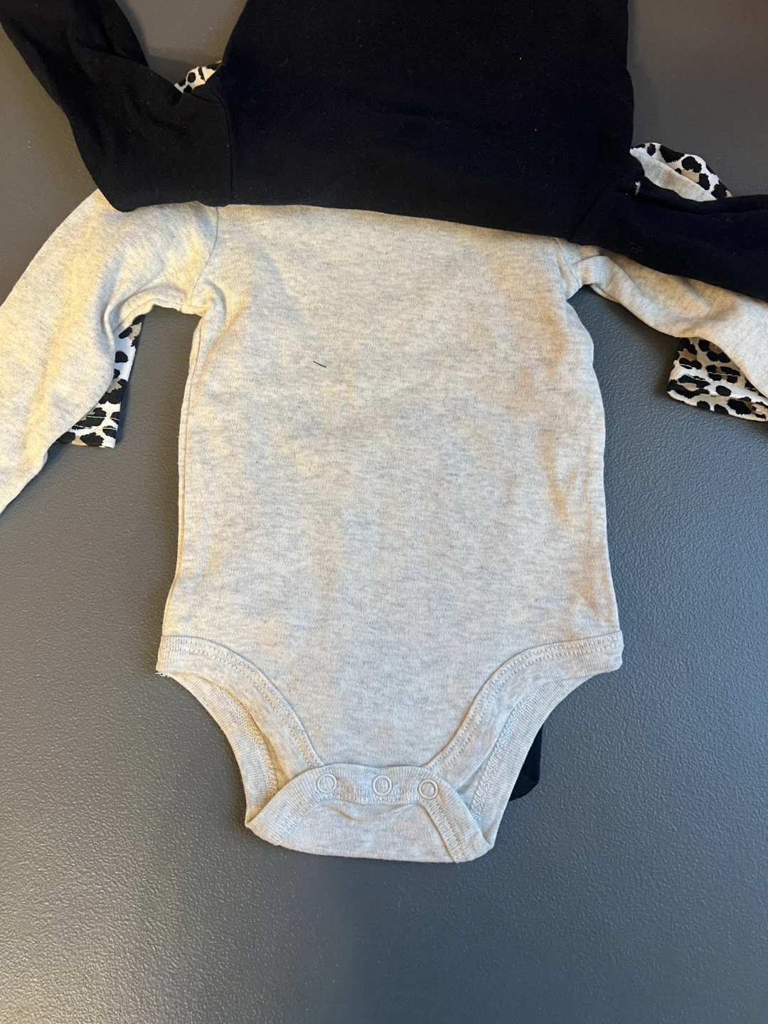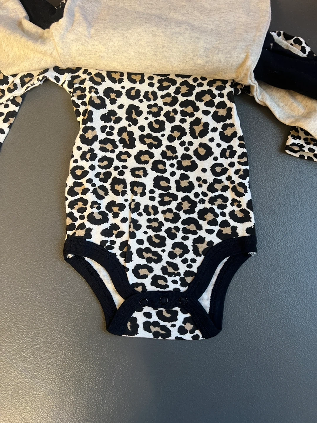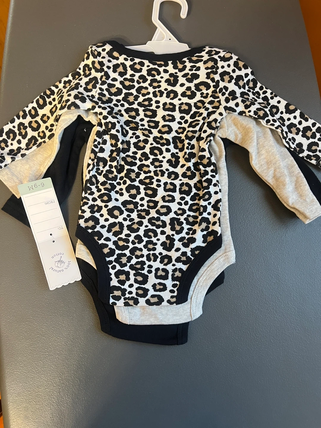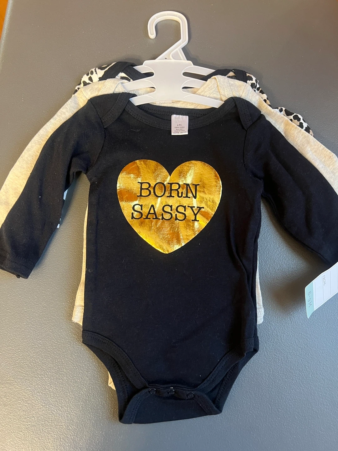 Selling a set of three adorable baby bodysuits! They are size 6-9 months and feature cute designs. One is light grey, one is black with a gold heart that says "Born Sassy", and the other is a fun leopard print. Perfect for your little one! These items are brand new. Items come from a pet free home. Port Union/401/Pickering for pick up.