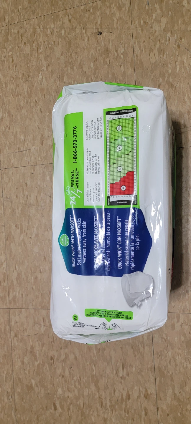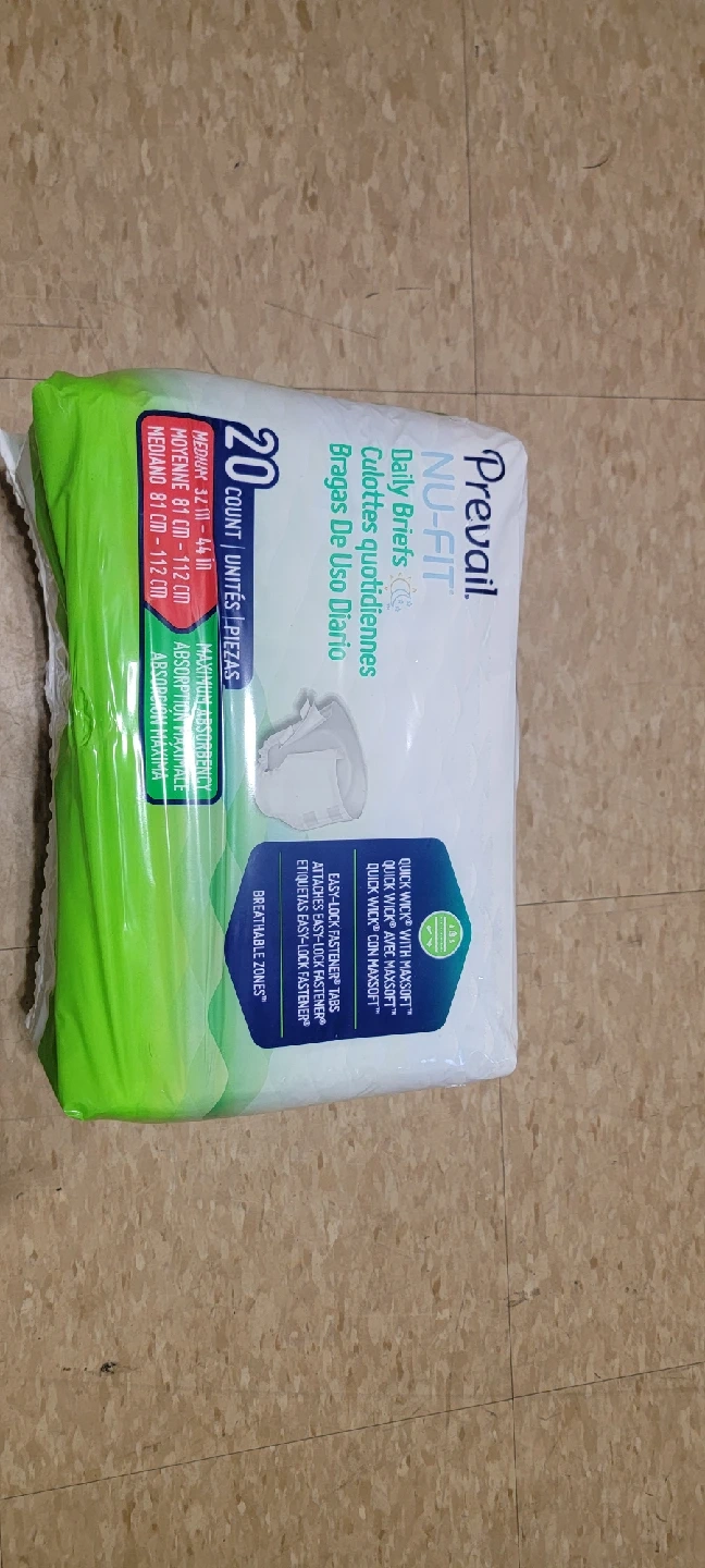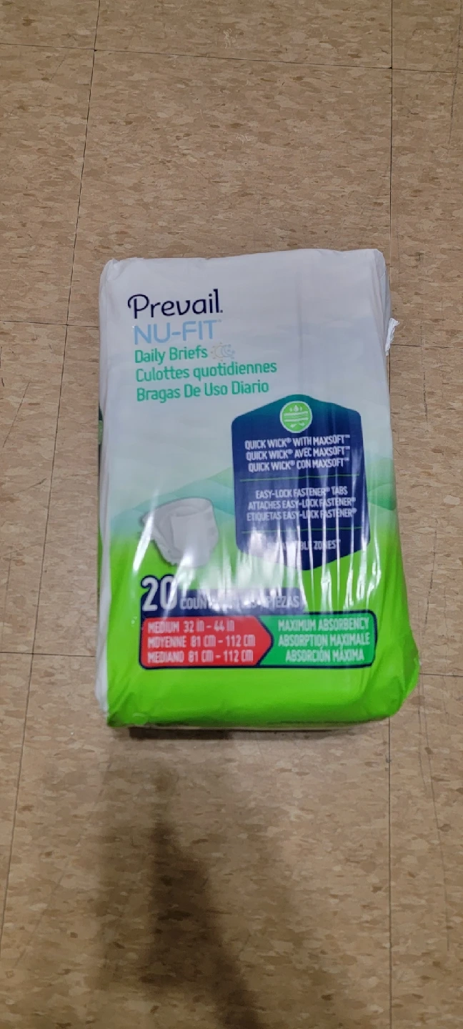 Selling a pack of Prevail Nu-Fit Daily Briefs. Size is Medium, fitting 32-44 inches (81cm - 112cm). The pack contains 20 briefs. Features include Quick Wick with Maxsoft for dryness and easy-lock fastener tabs.