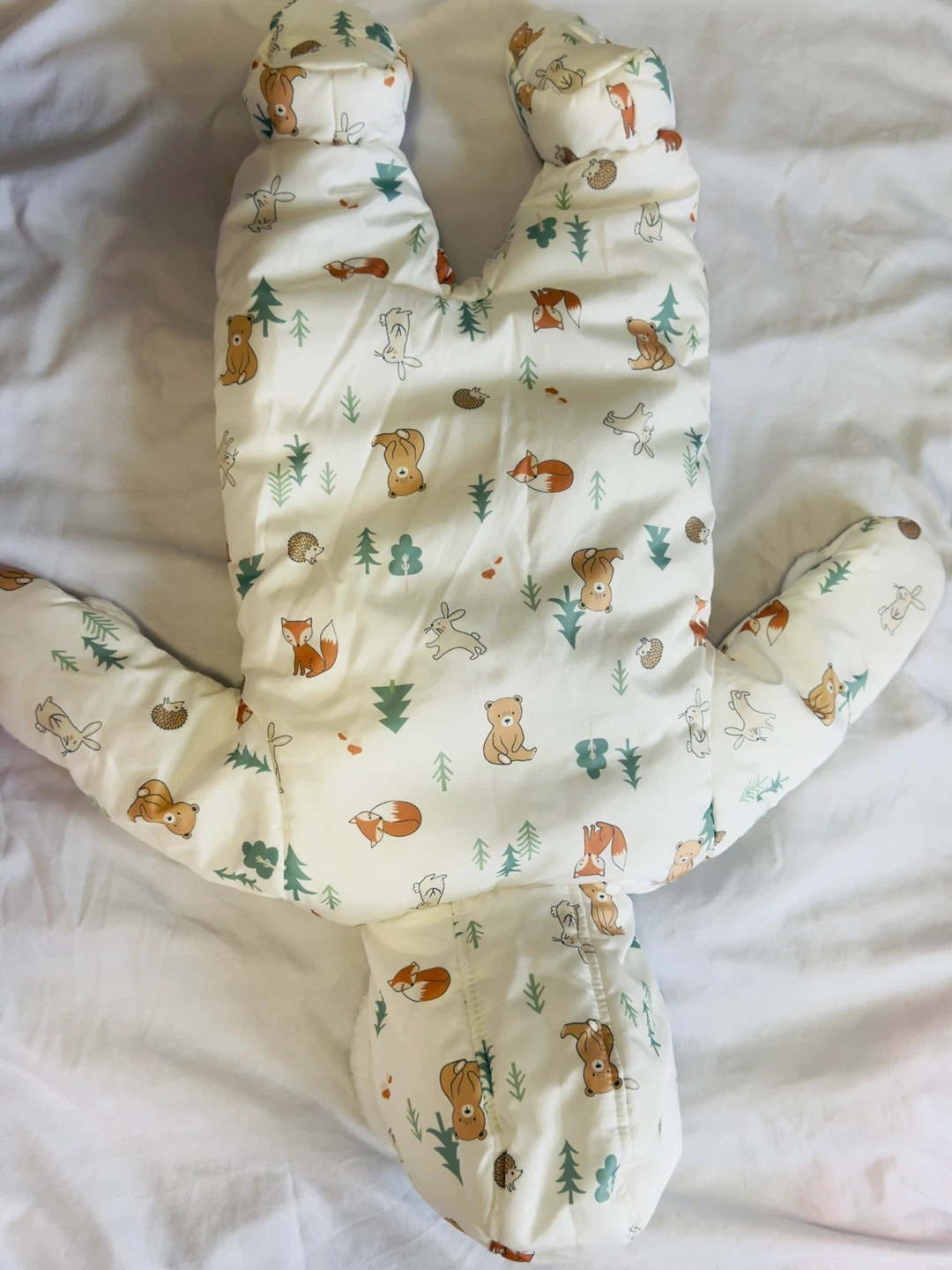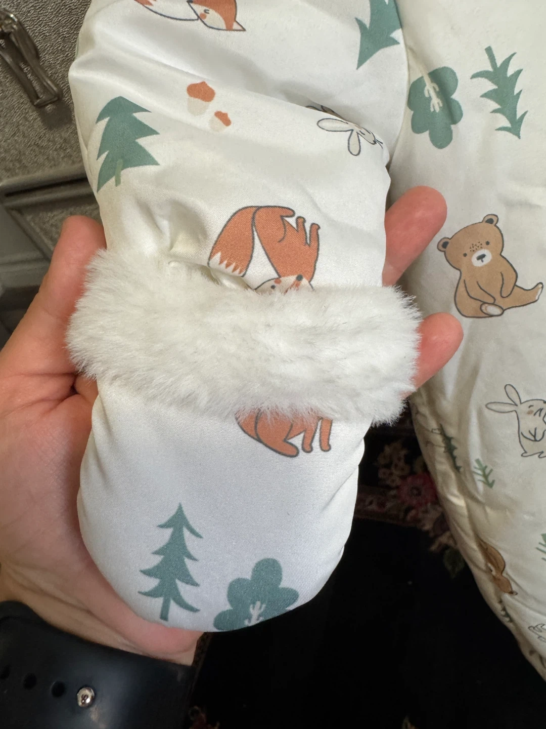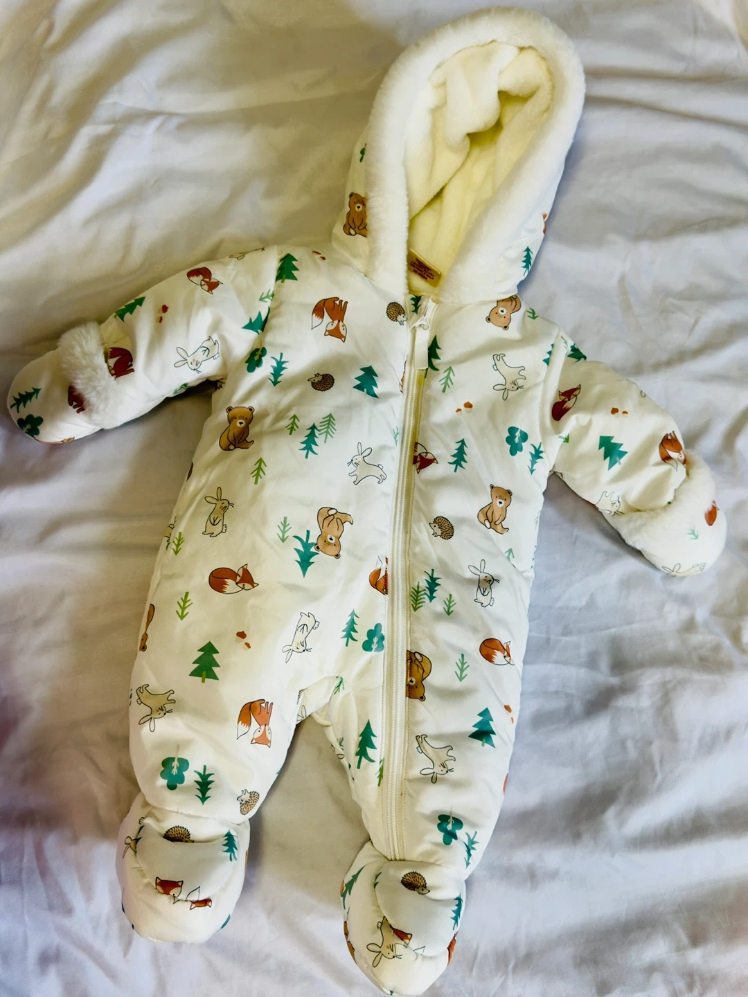 Super cute baby snowsuit in size 0-3 months! It has a fun pattern with bears, foxes, trees, and other woodland creatures. Perfect for keeping your little one warm and cozy this winter