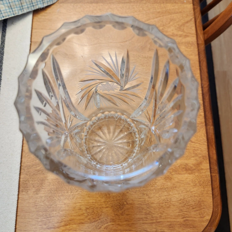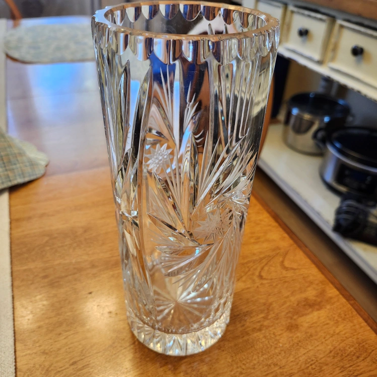 Beautiful crystal vase featuring a lovely starburst design. It's in great condition and would look lovely with flowers or as a standalone decorative piece