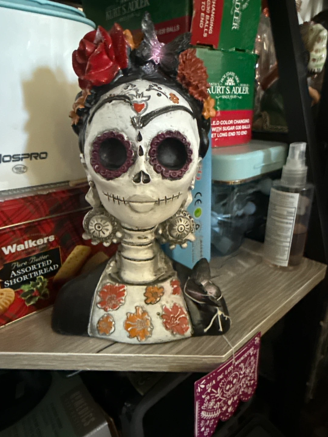 Selling a New Dia de los Muertos figurine resembling Frida Kahlo. It's a colorful and unique piece, perfect for adding a touch of cultural flair to your decor. The figurine features intricate details and vibrant colors, making it a standout item.