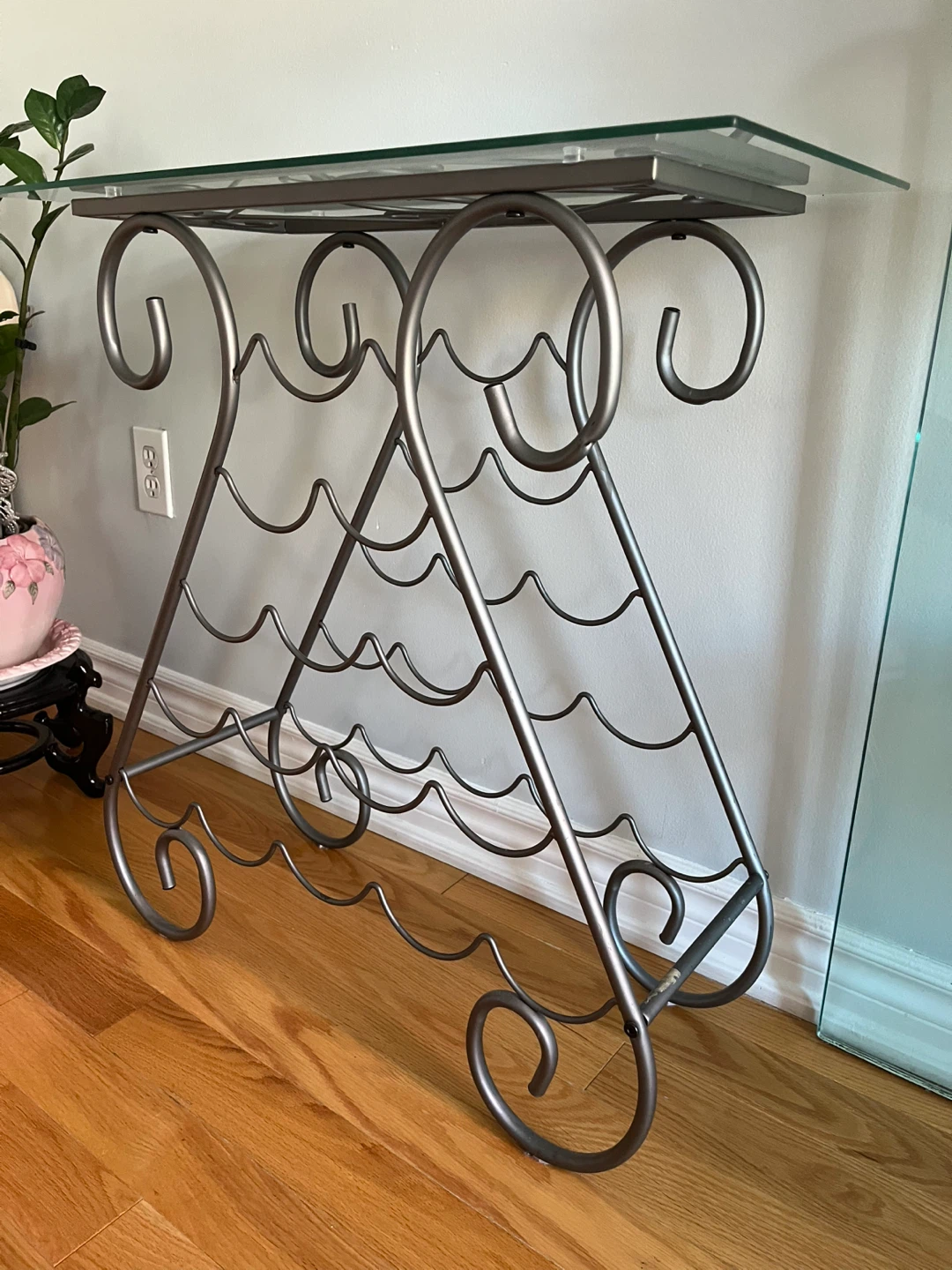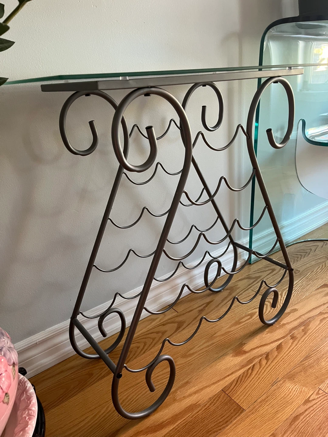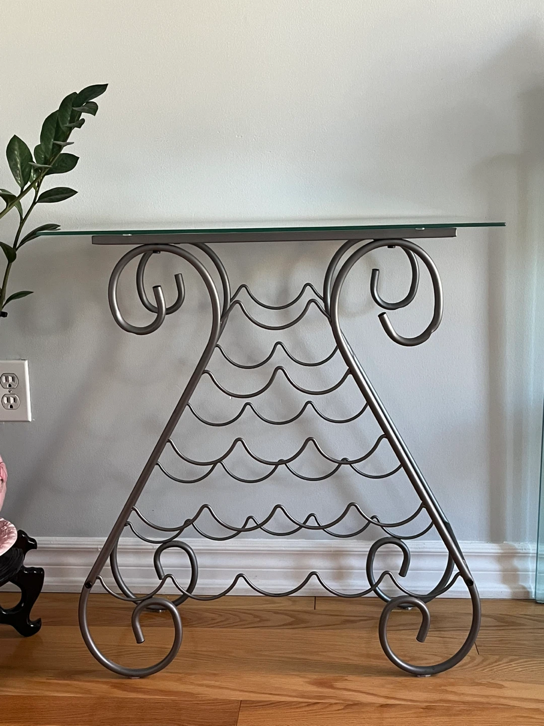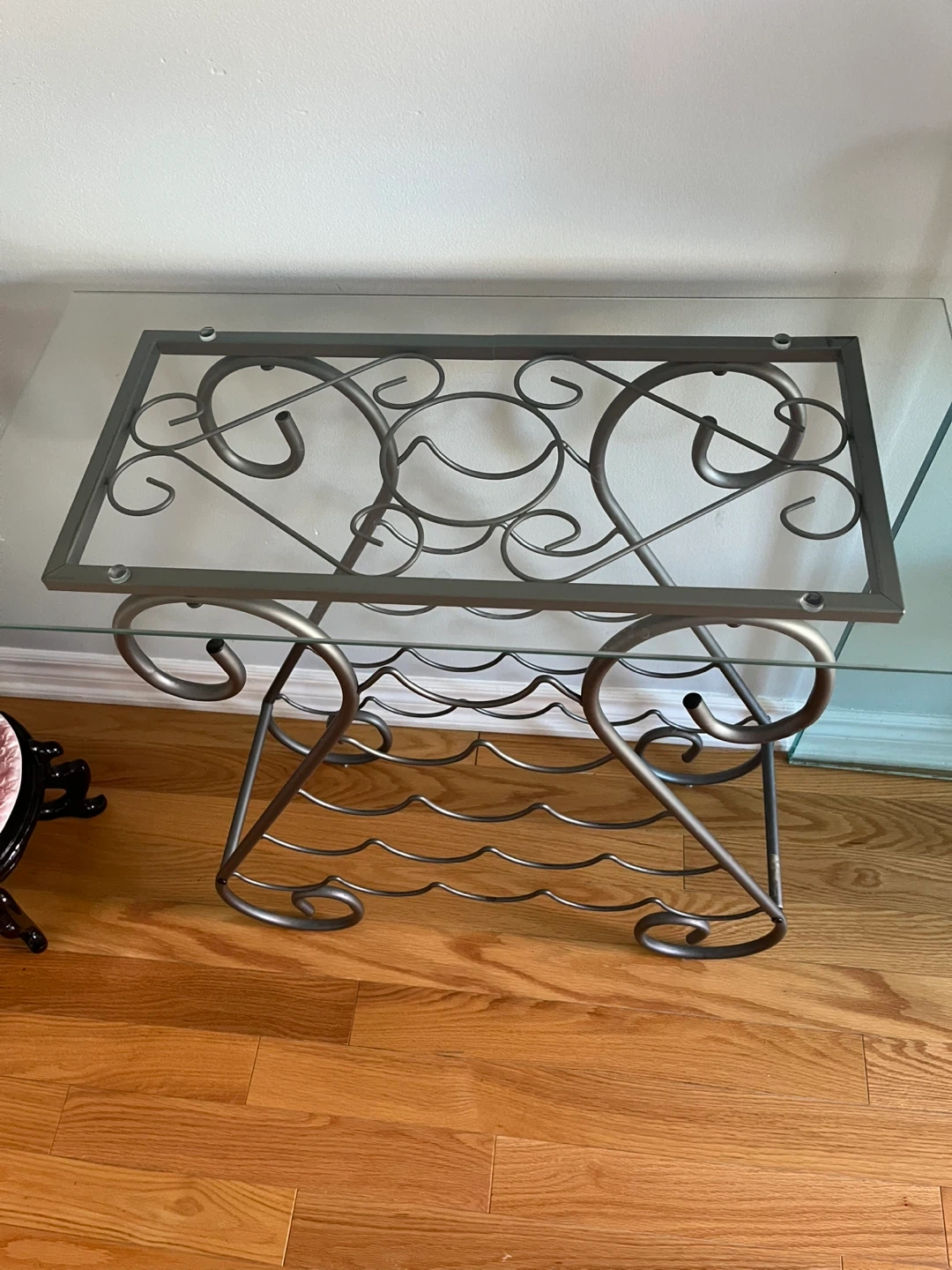 Stylish metal wine rack table with a glass top! It's a great way to display your favourite wines and add a touch of elegance to your home. The rack holds several bottles and the glass top provides a convenient surface for serving or display.