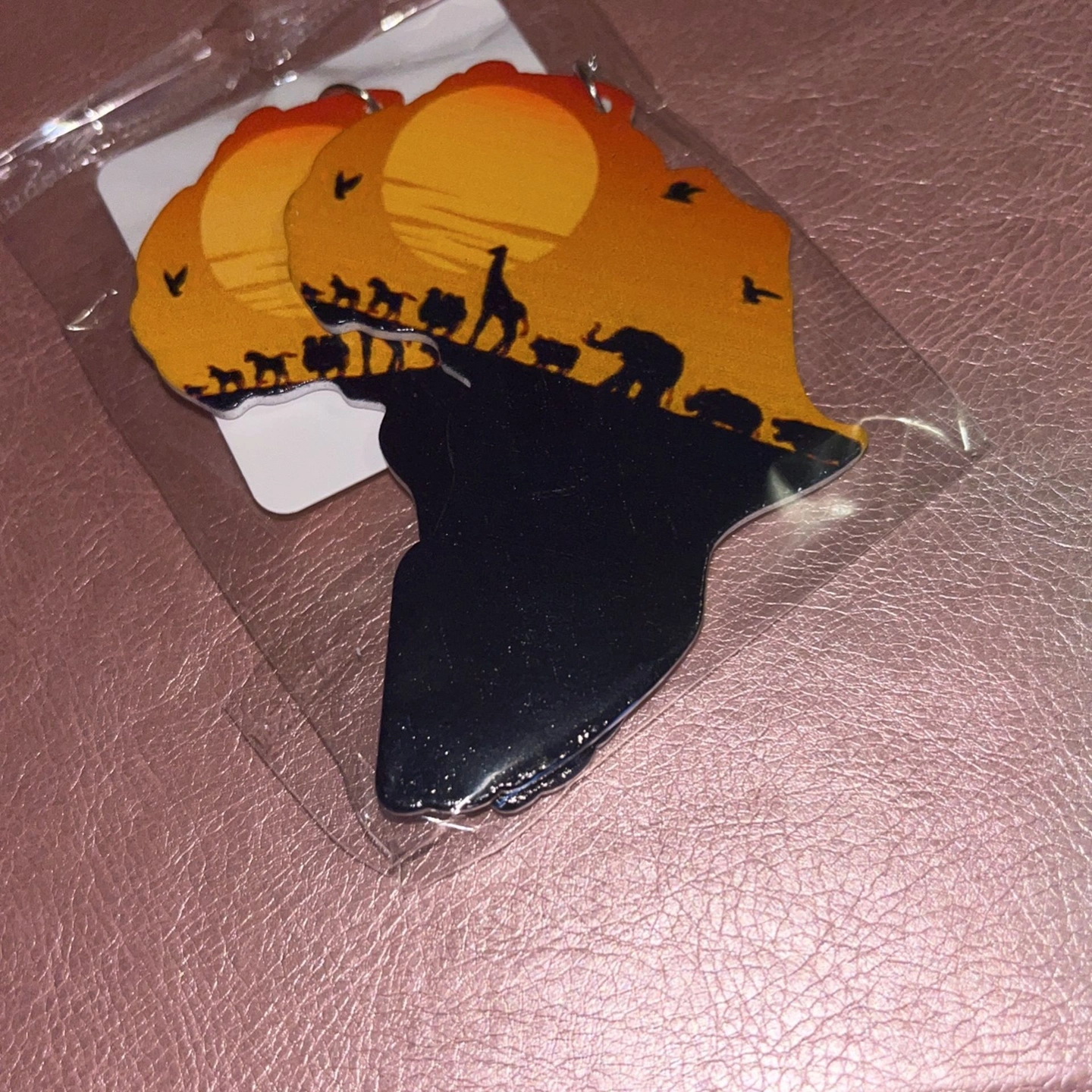 African continent shaped earrings with the sun, birds, zebras, rhinos, elephant, giraffe, etc.