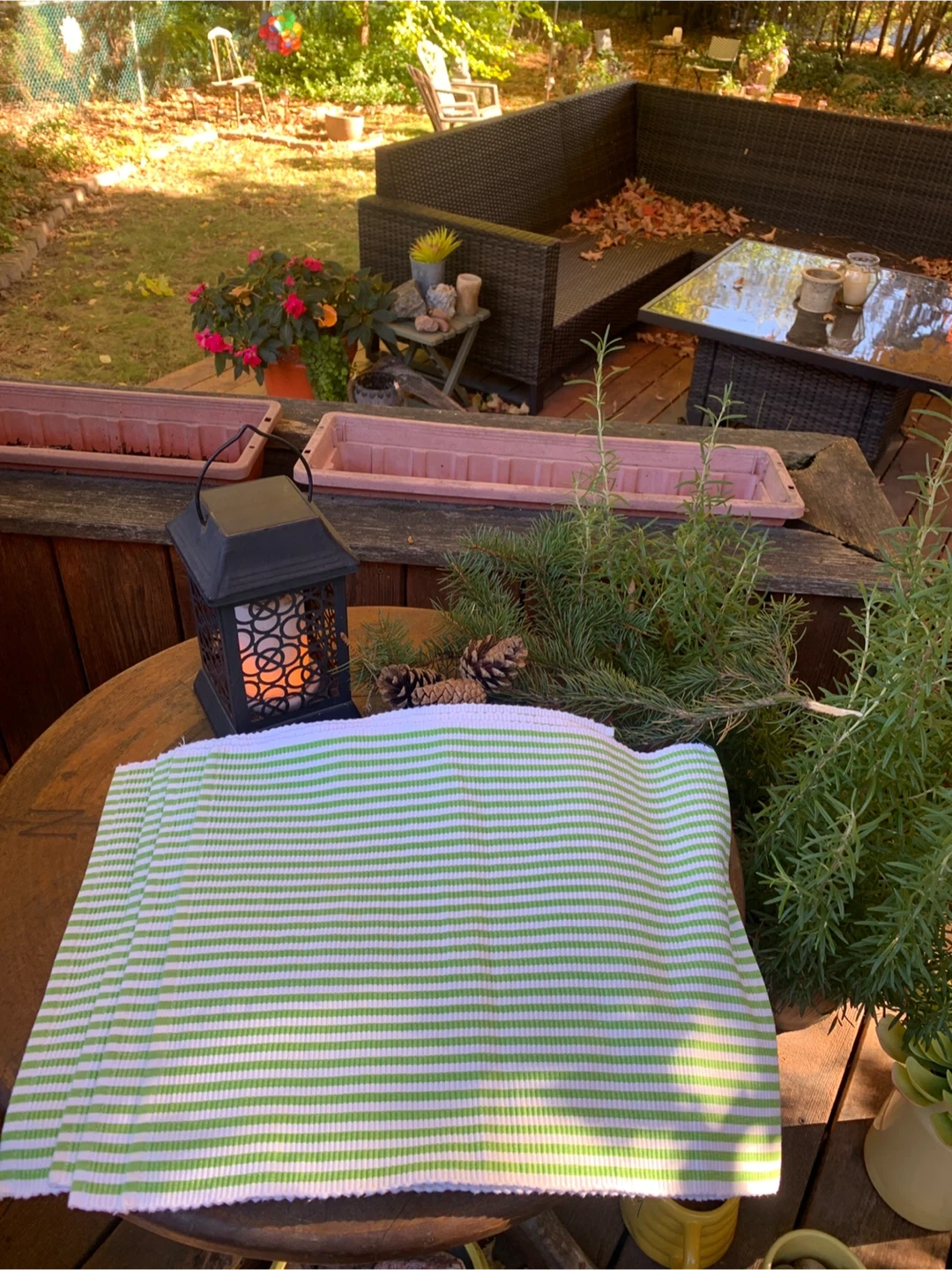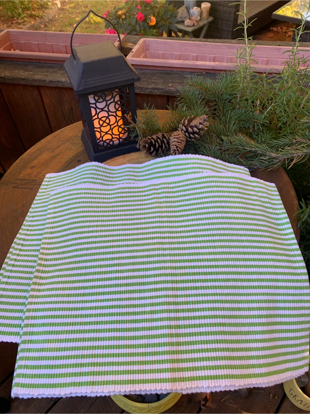 Selling a set of four placemats from Vivre! They feature a cute green and white striped pattern and are a cotton twill like material. They look to be in brand new condition. Measurements are approximately 17 inches by 13 inches. Perfect for adding a fresh touch to your dining table! Would look cute for a holiday tablescape! These would also make a nice holiday gift!