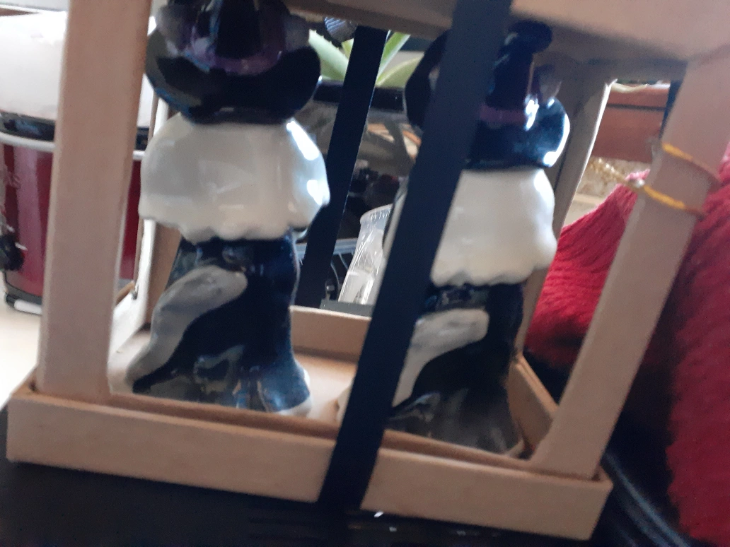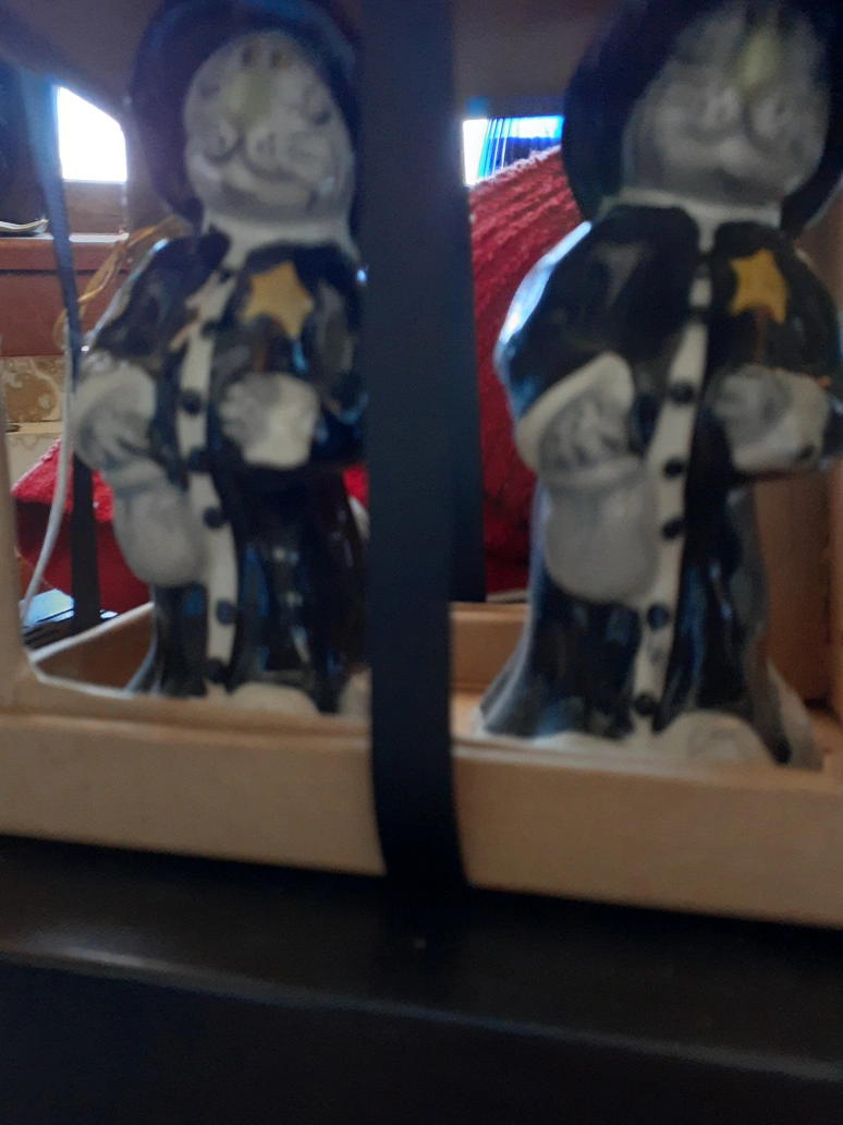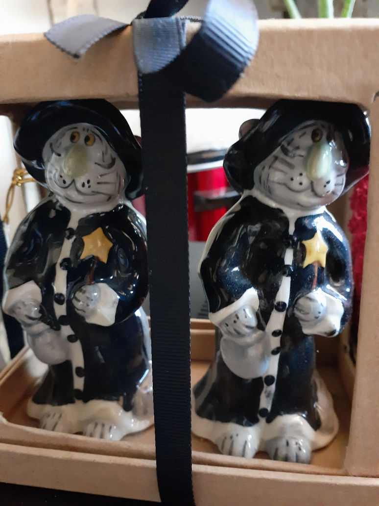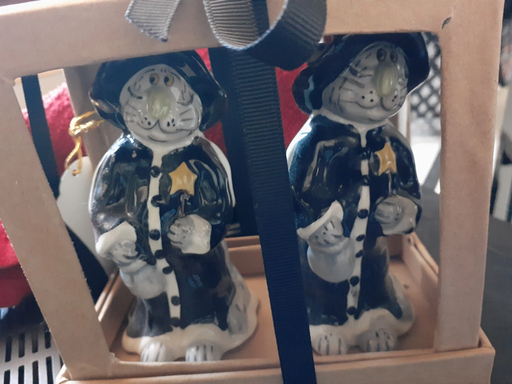 Here's a cute pair of cat figurines, dressed in black coats and hats with a star on their chest! They come in a decorative box with a ribbon, perfect for a gift or to add some charm to your home. 4" tall.