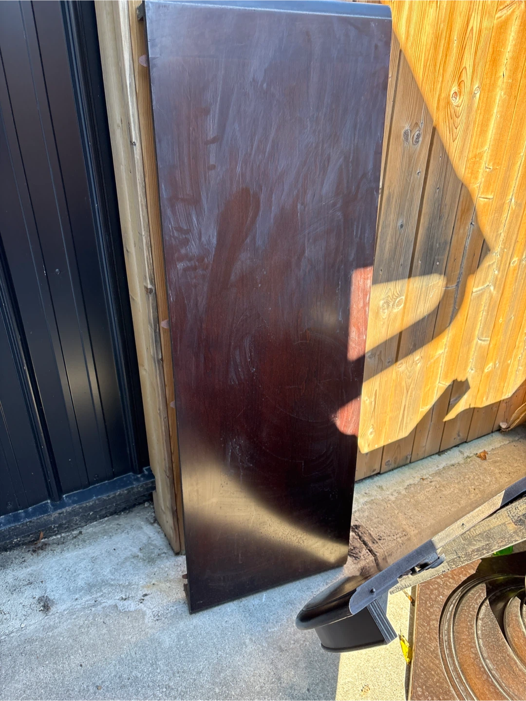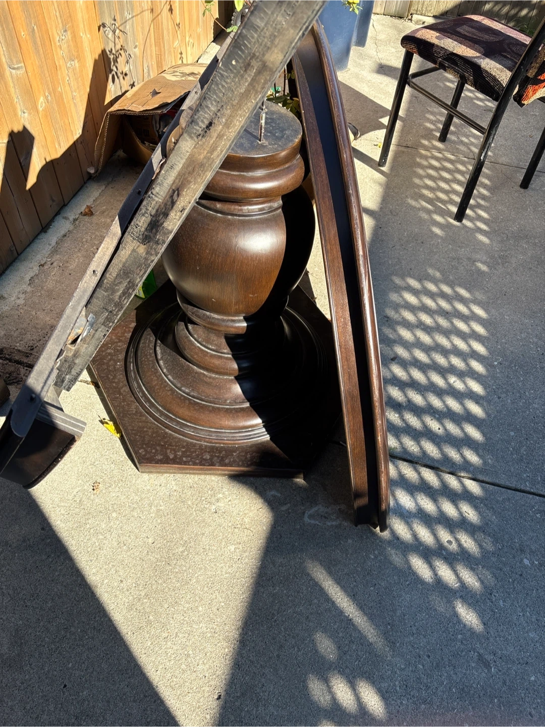 Selling a wooden table top and legs. The table appears to be partially disassembled. The wood has a dark brown finish. Great for a DIY project! The table is solid wood and a perfect addition to any home