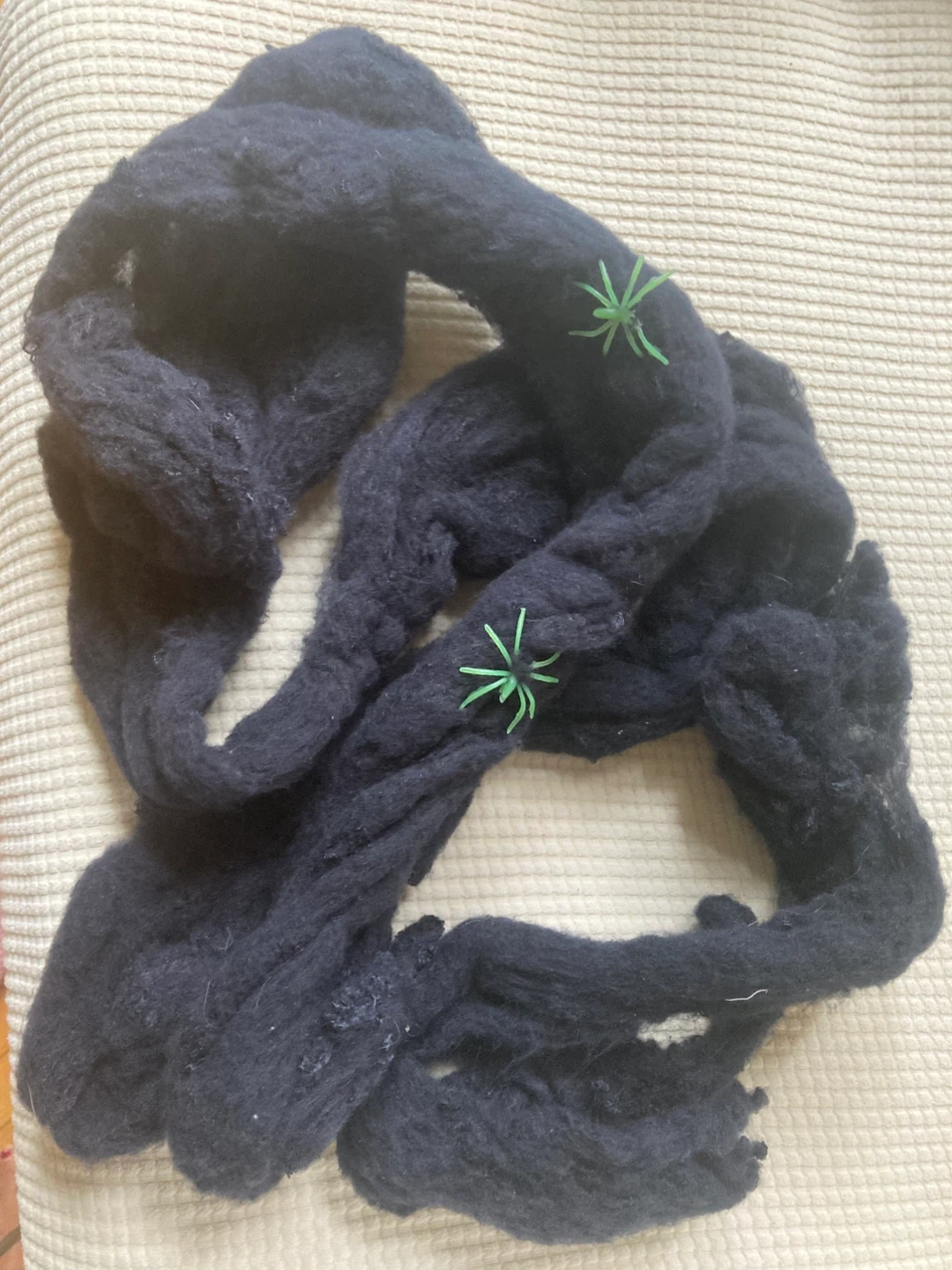 Free Halloween spider web decoration. It's a spooky addition to your Halloween setup! It has some small green spiders attached to it.