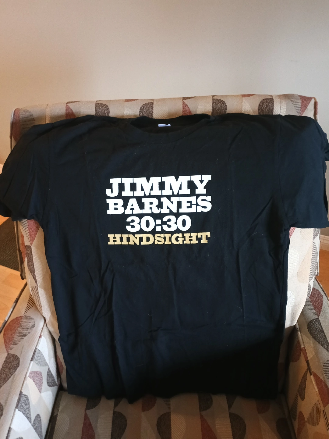 Selling a Jimmy Barnes t-shirt in black. The shirt features the text "JIMMY BARNES 30:30 HINDSIGHT". It's in great condition and ready for a new home!