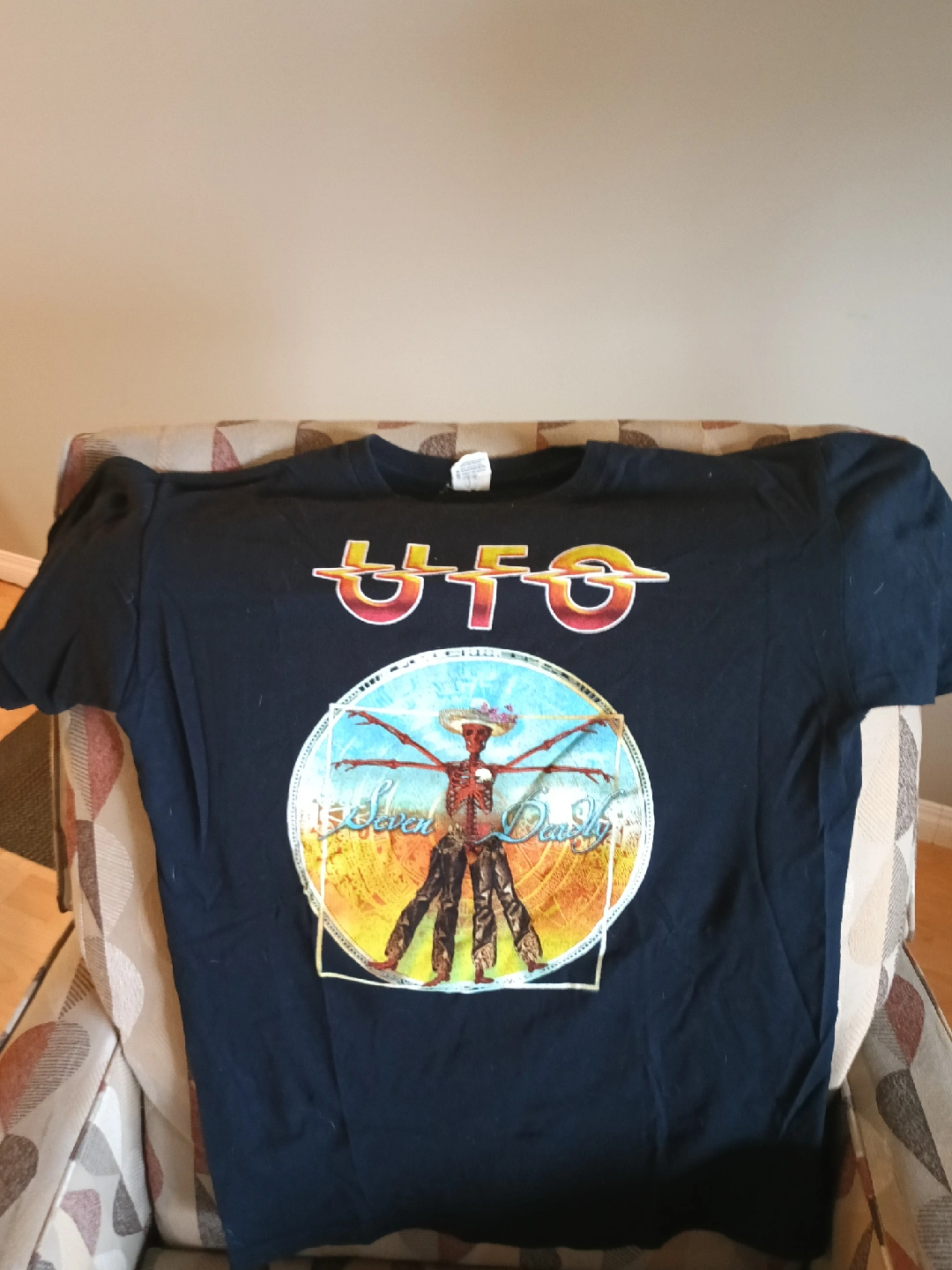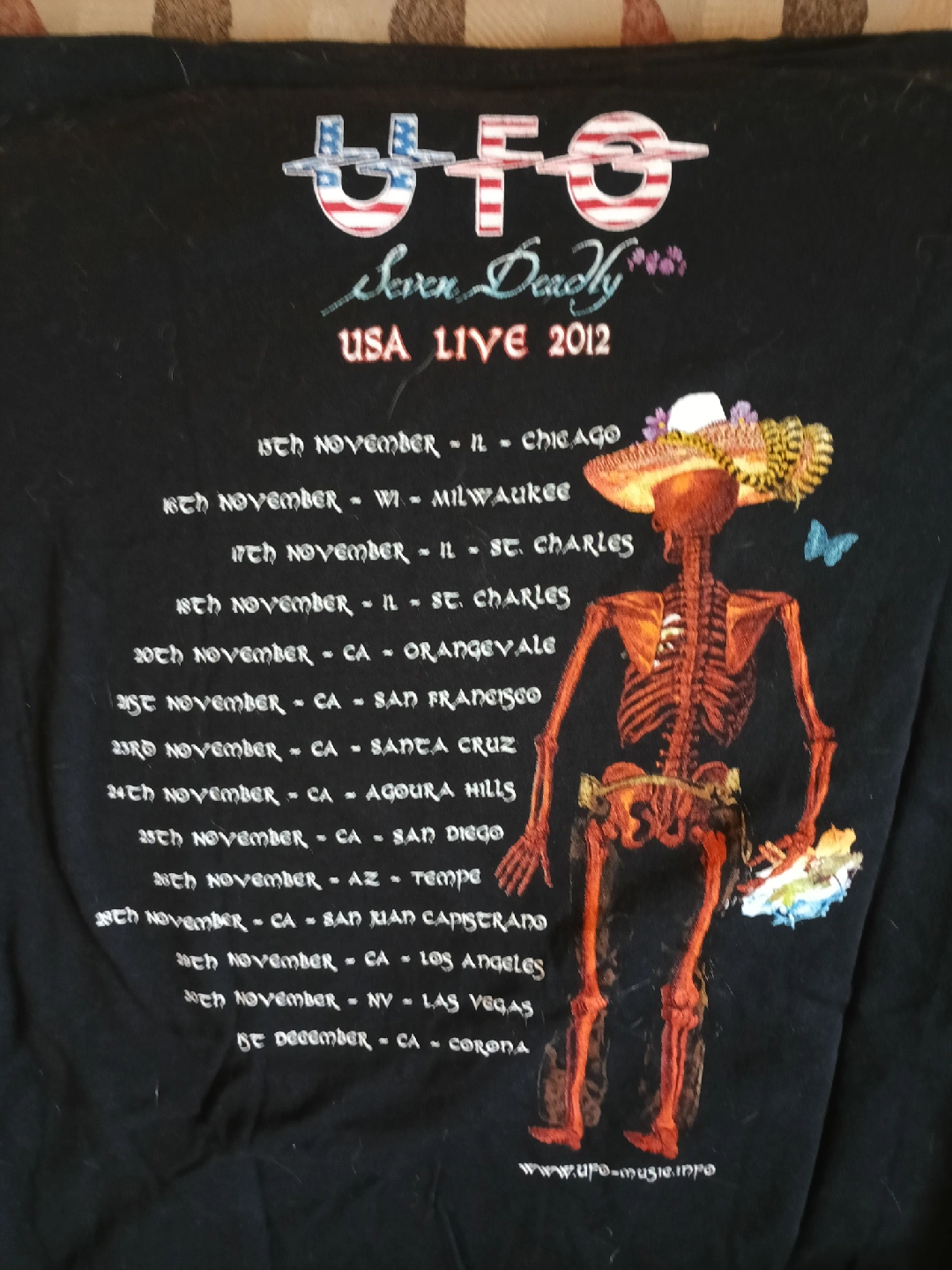 Selling a black UFO Seven Deadly USA LIVE 2012 t-shirt. It features a concert tour design with dates and locations. Great for any UFO fan!