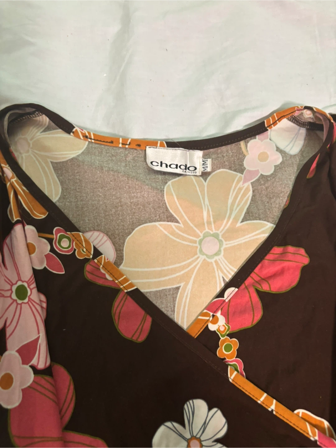 Selling a cute Chado floral wrap top in size M! It features a brown background with a colourful floral pattern. Perfect for adding a bit of flair to your wardrobe