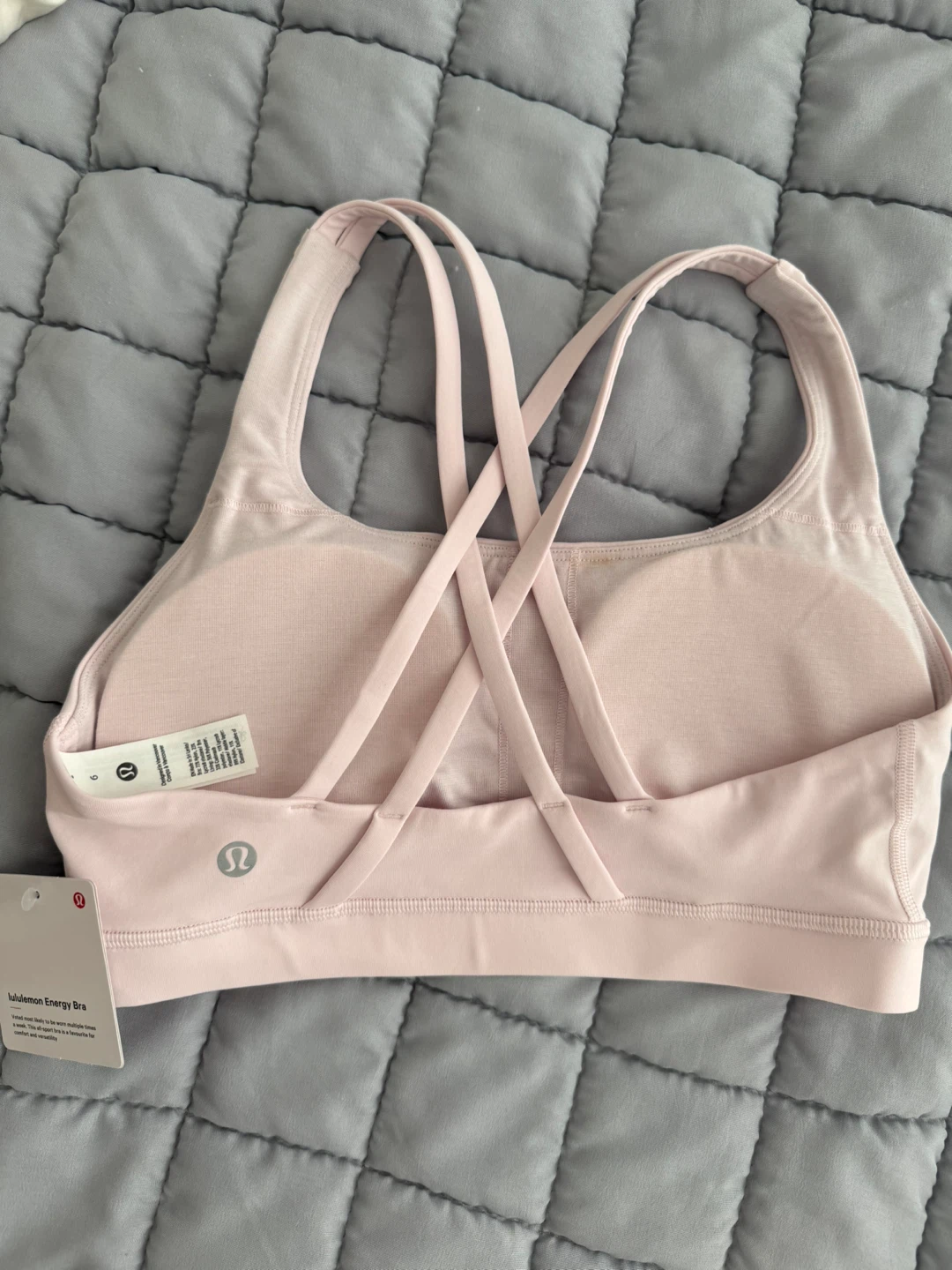 Selling a brand new Lululemon Energy Bra in size 6. It's a beautiful light pink colour (BLLP). This all-sport bra is a favourite for comfort and versatility, voted most likely to be worn multiple times a week