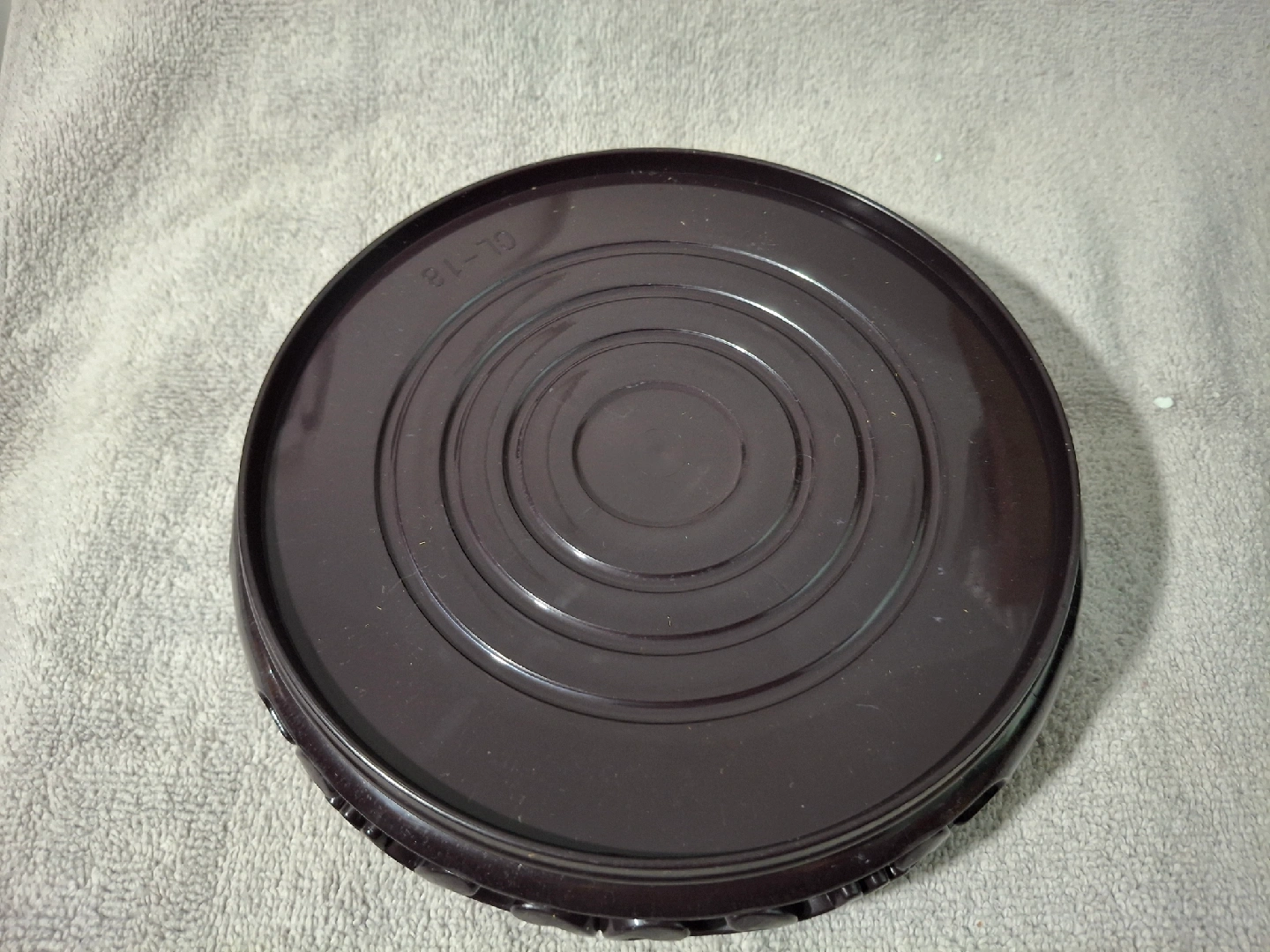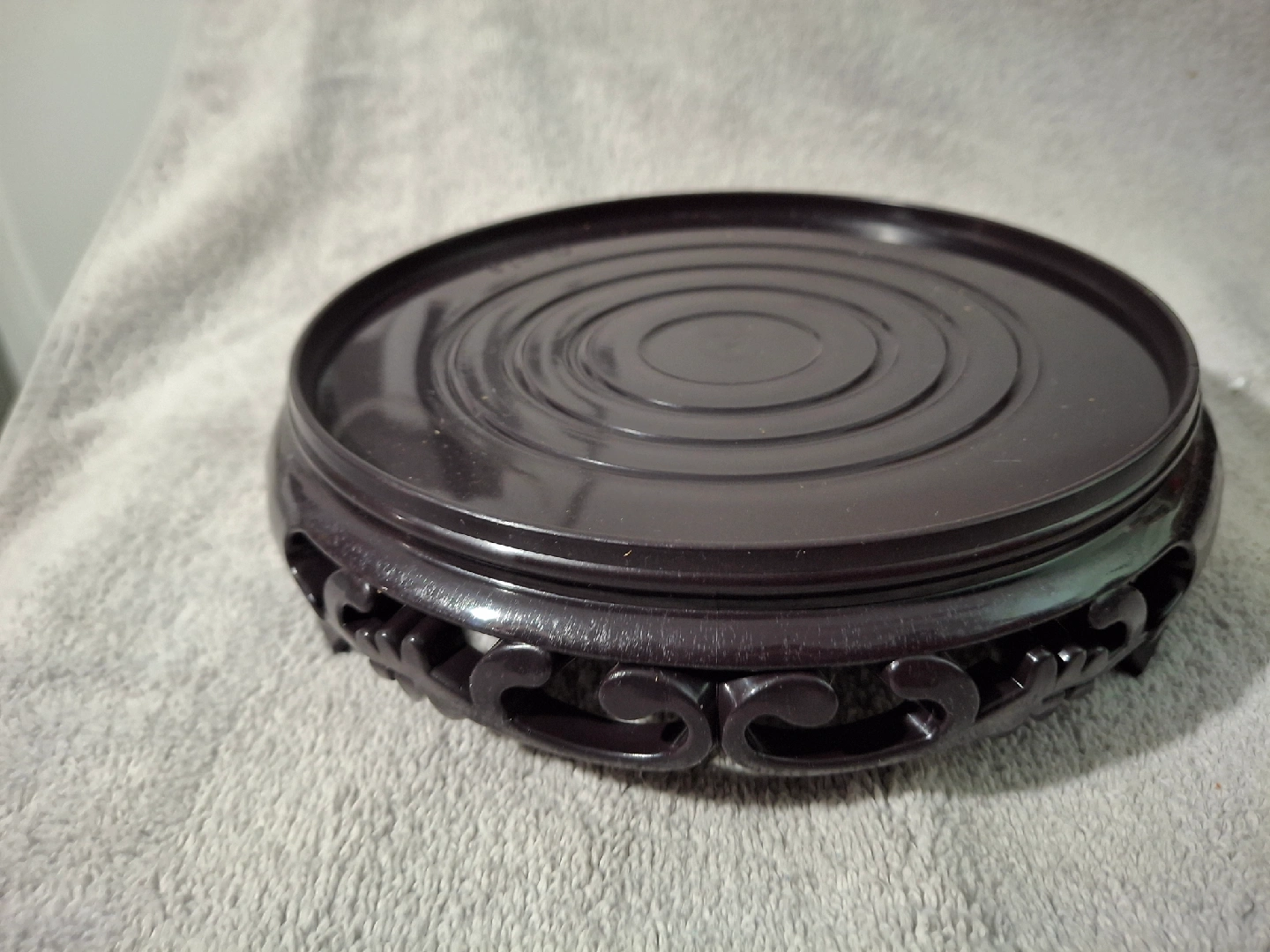 Here's a lovely round plastic display stand! It's perfect for displaying your favourite items, from vases to sculptures. The dark brown colour and decorative carvings add a touch of elegance to any space