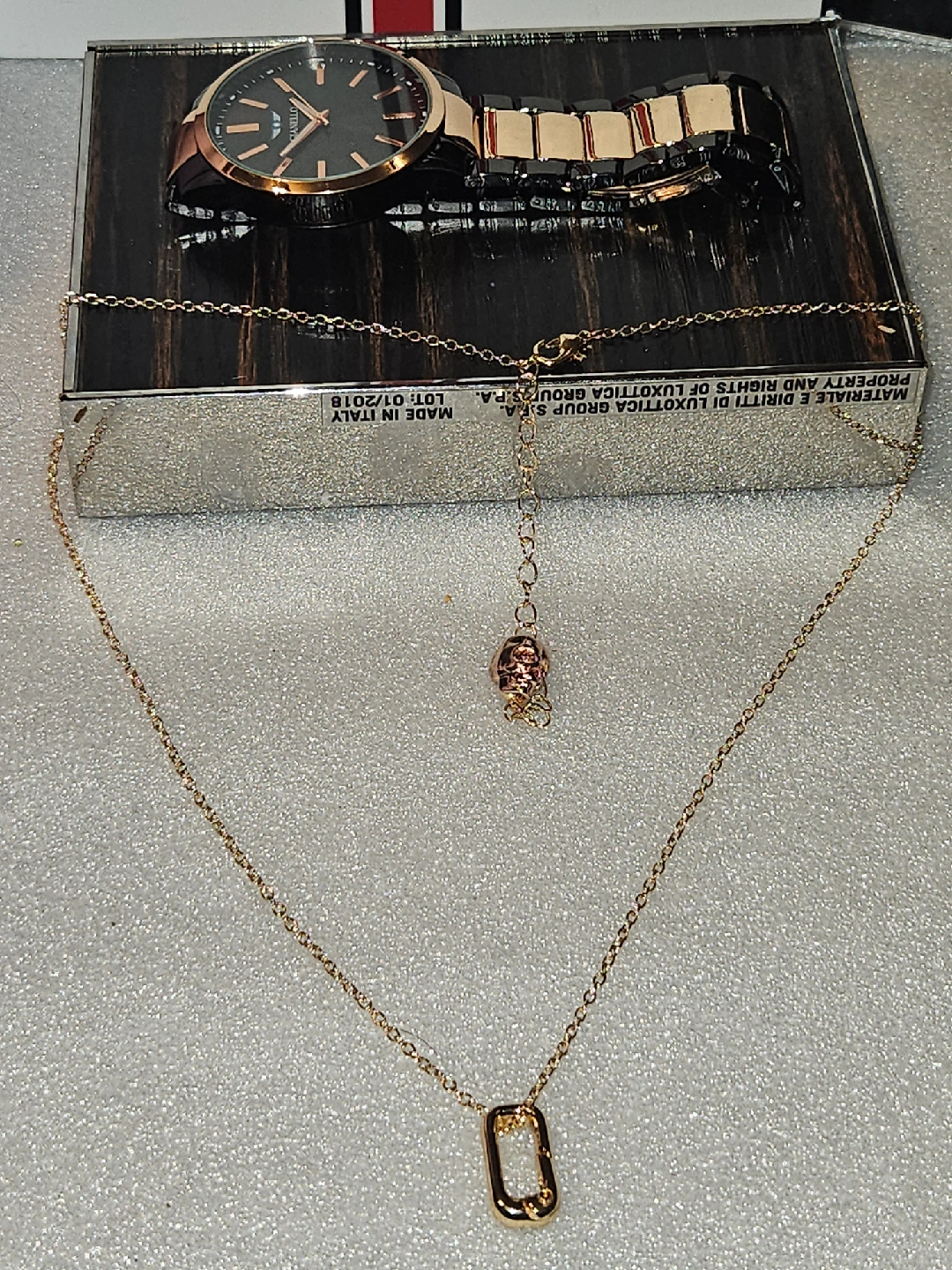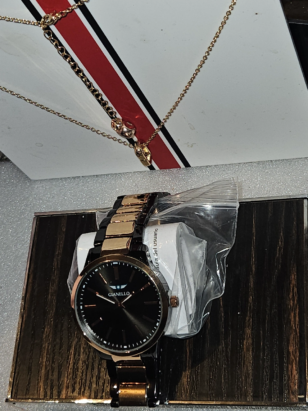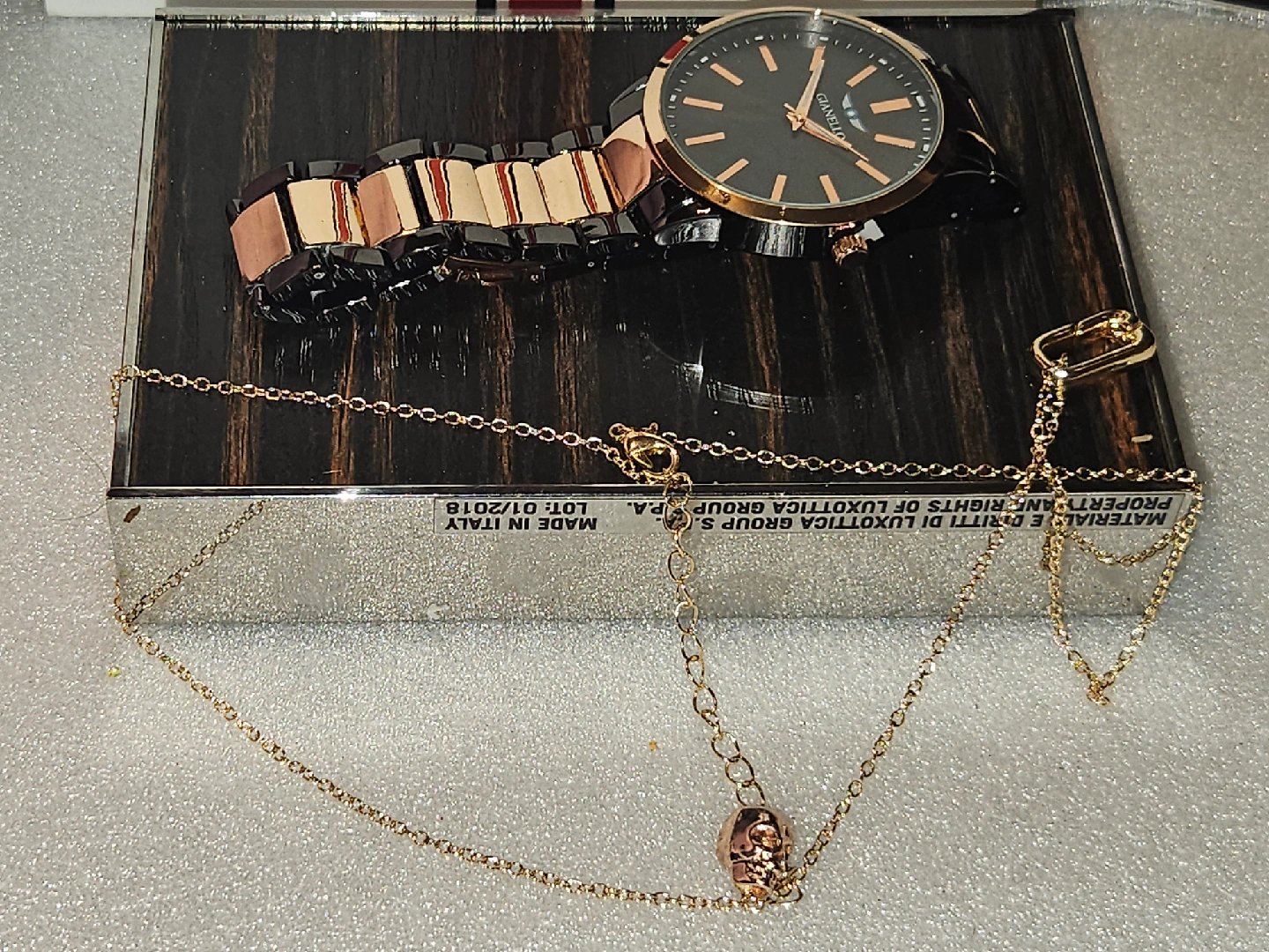 Selling a stylish Gianello watch with an Italian design! The watch features a stainless steel case-back and a sleek black and rose gold colour scheme. It's a great accessory for any outfit! water resistant and scratch resistant lenses,