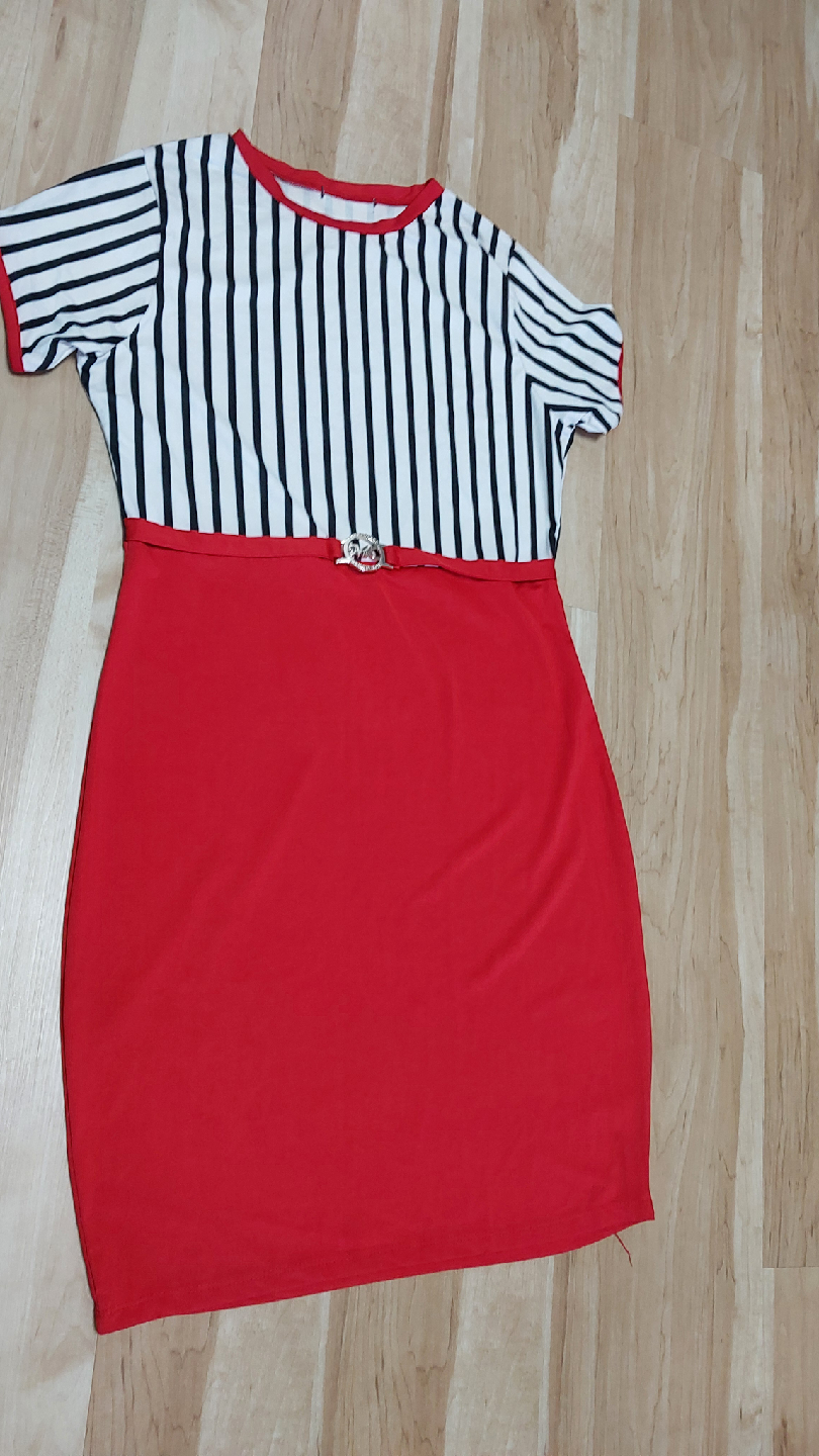 Nrw but tag cut out please see pics. A cute red and striped dress. It features a black and white striped top with a solid red bottom. There's also a decorative belt at the waist