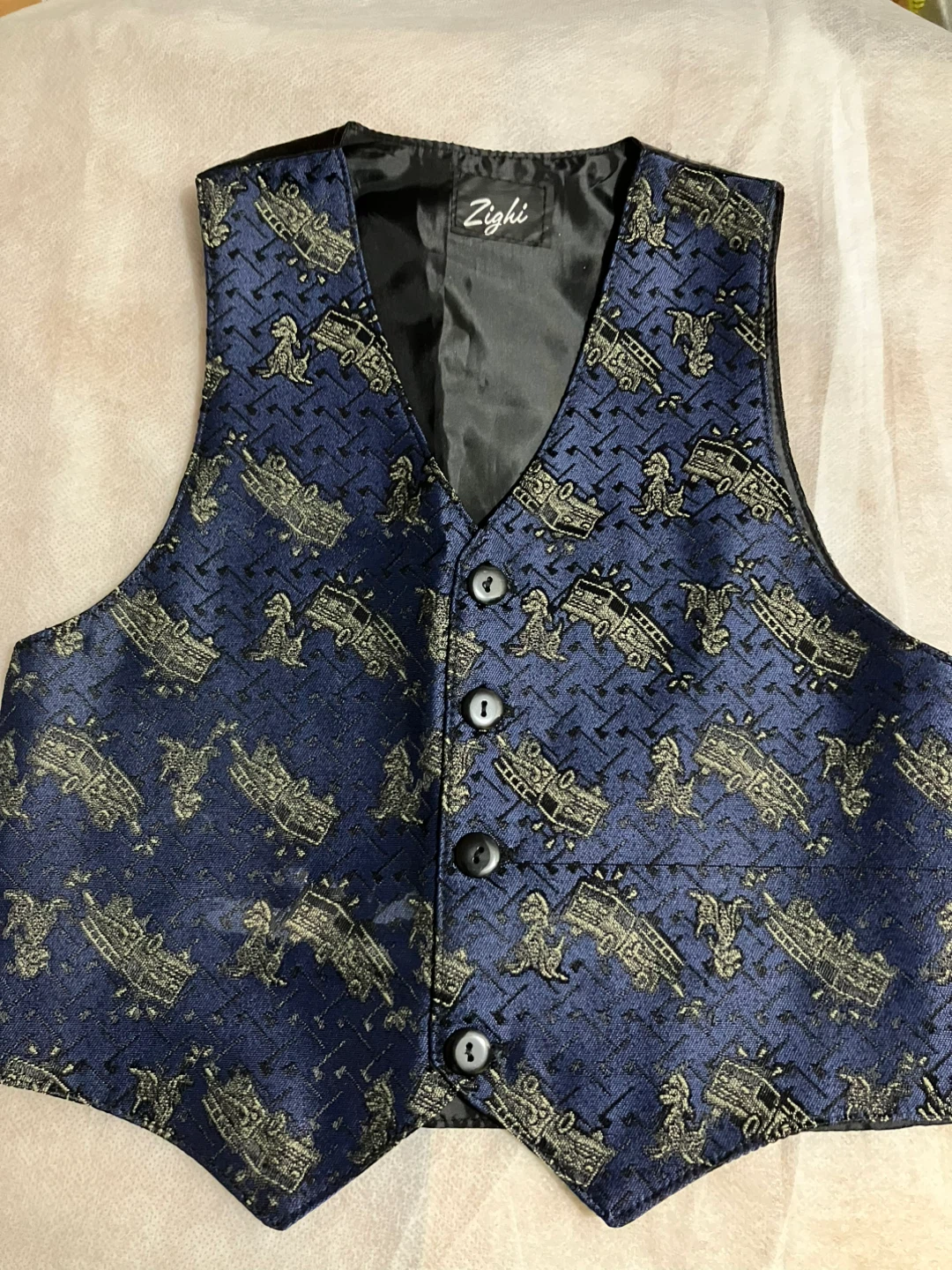 Selling a Zighi vest in navy blue with a fun firetruck pattern! It's in great condition and perfect for adding a unique touch to any outfit. The material feels nice and the buttons are all securely attached Kids size 5