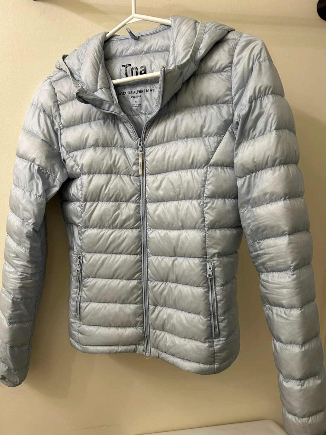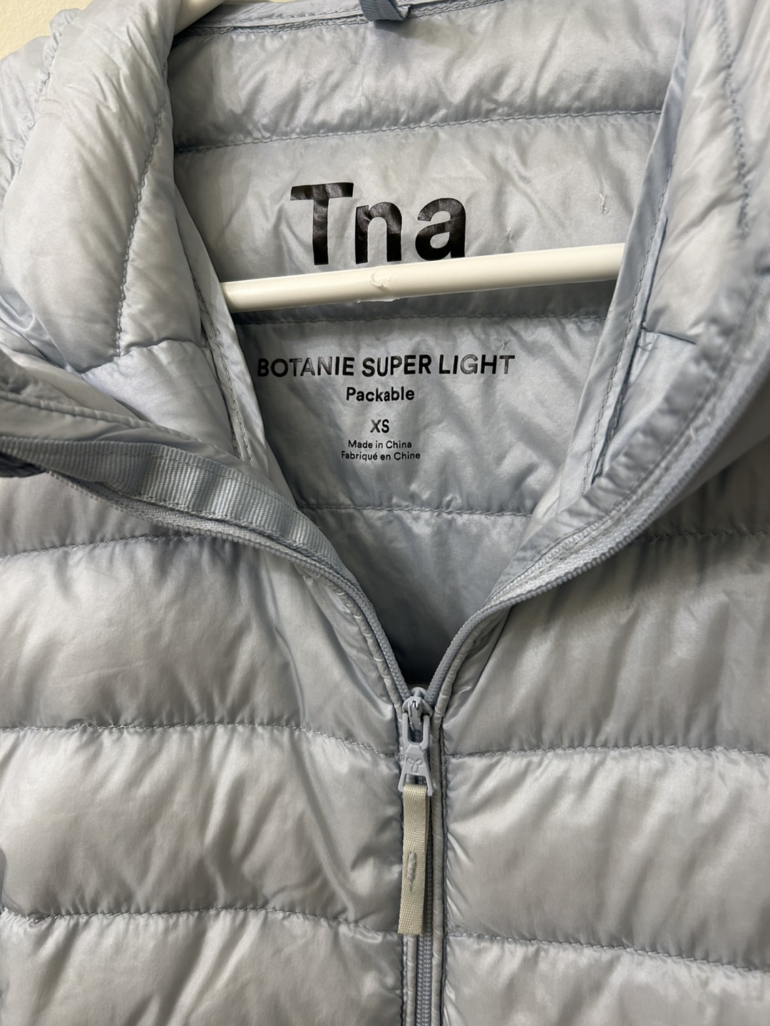 Selling a TNA Botanie Super Light puffer jacket in size XS. It's a lovely light blue colour and in great condition. This jacket is packable, making it super convenient for travel or everyday use!