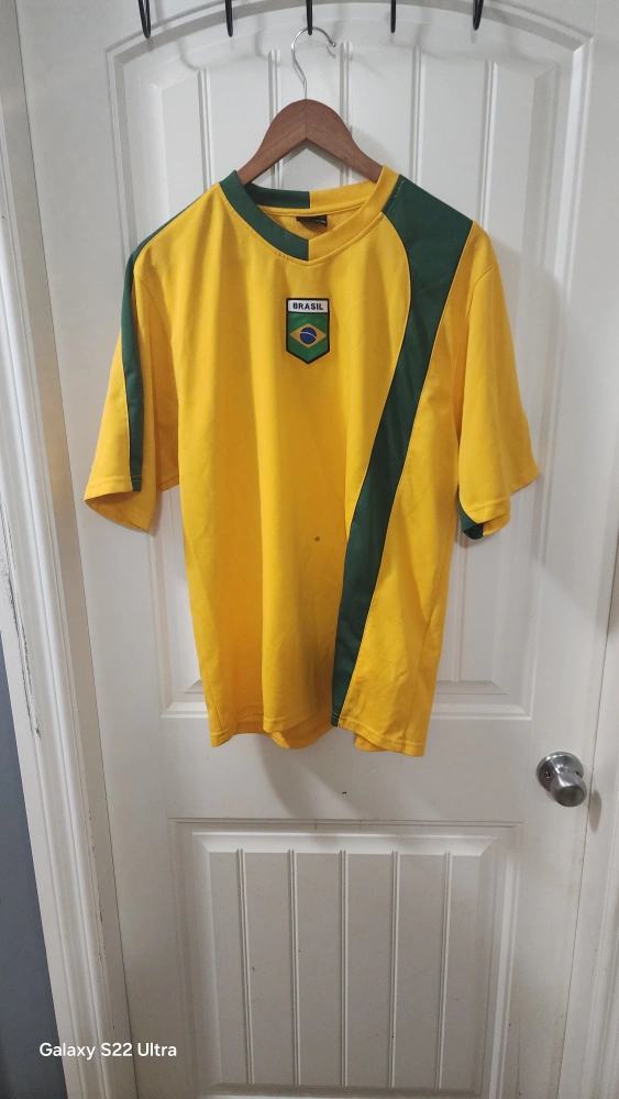 83Selling a Brasil soccer jersey in yellow and green. It features the word "BRASIL" on the back and the Brasilian flag on the front. It's in good condition and ready for a new home!