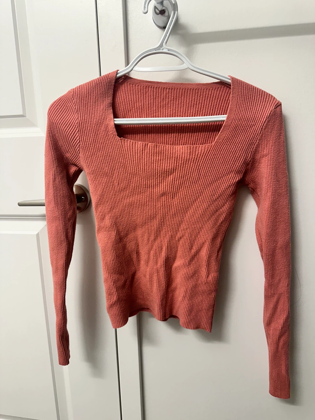 Coral-coloured long-sleeve top with a square neckline and ribbed texture