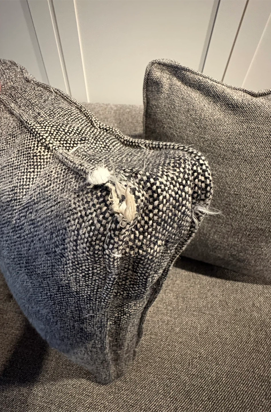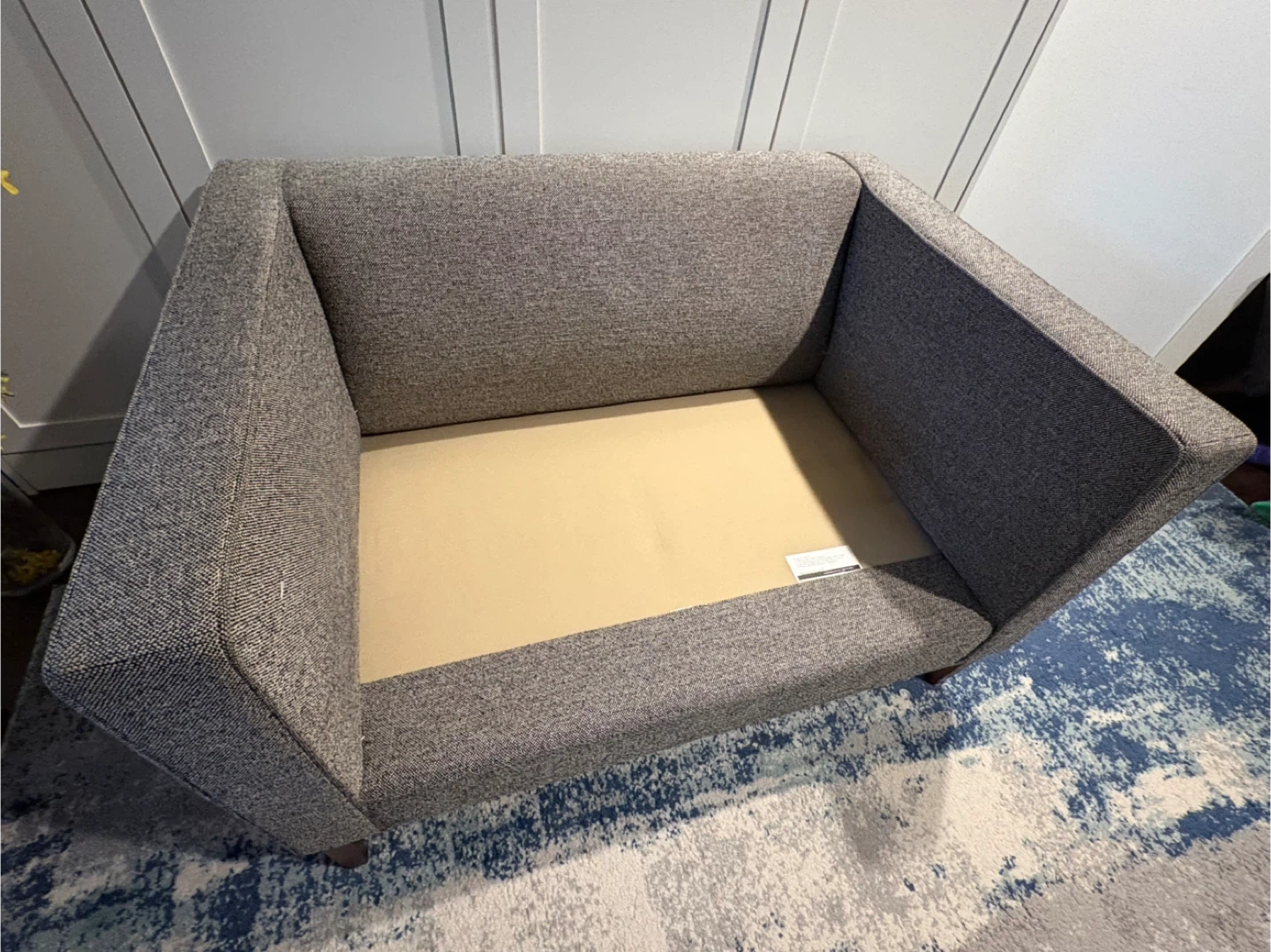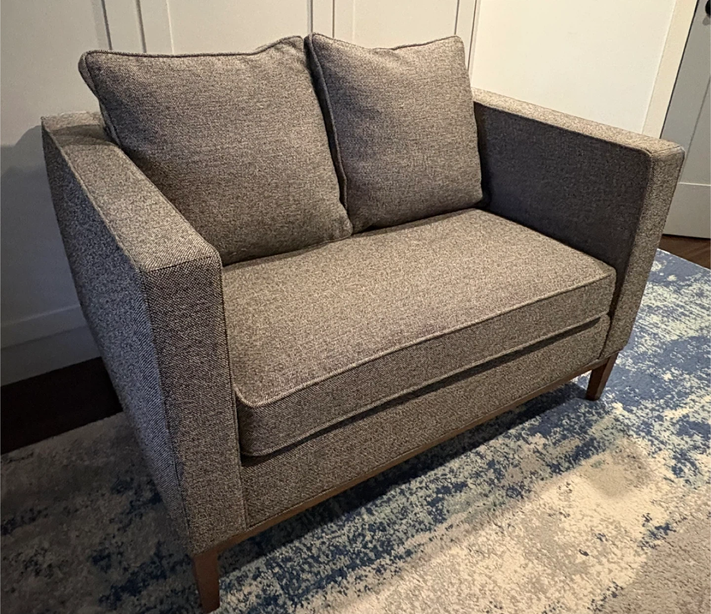 Selling a comfy chair-and-a-half/loveseat sofa. It features a modern design with a textured salt-and-pepper fabric. Perfect for a small space or as an accent piece in a larger room. Dimensions are 46”w x 33”d x 28”h (18” seat height). Solid wood frame with walnut legs. Seat cushion is foam-wrapped in feathers, and back cushion is stuffed with feathers. Small bite damage on corner of one back cushion (pictured) and front left leg has been repaired from damage by movers. It's a great piece of furniture and ready for a new home!