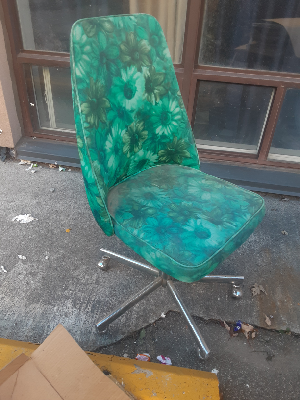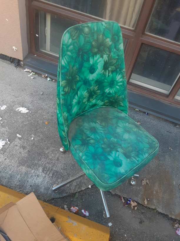 fun floral swivel desk chair! It's got a vibrant green pattern that would add a pop of colour to any room. The chair has a comfortable seat and back, perfect for long study or work sessions. chrome on the bottom