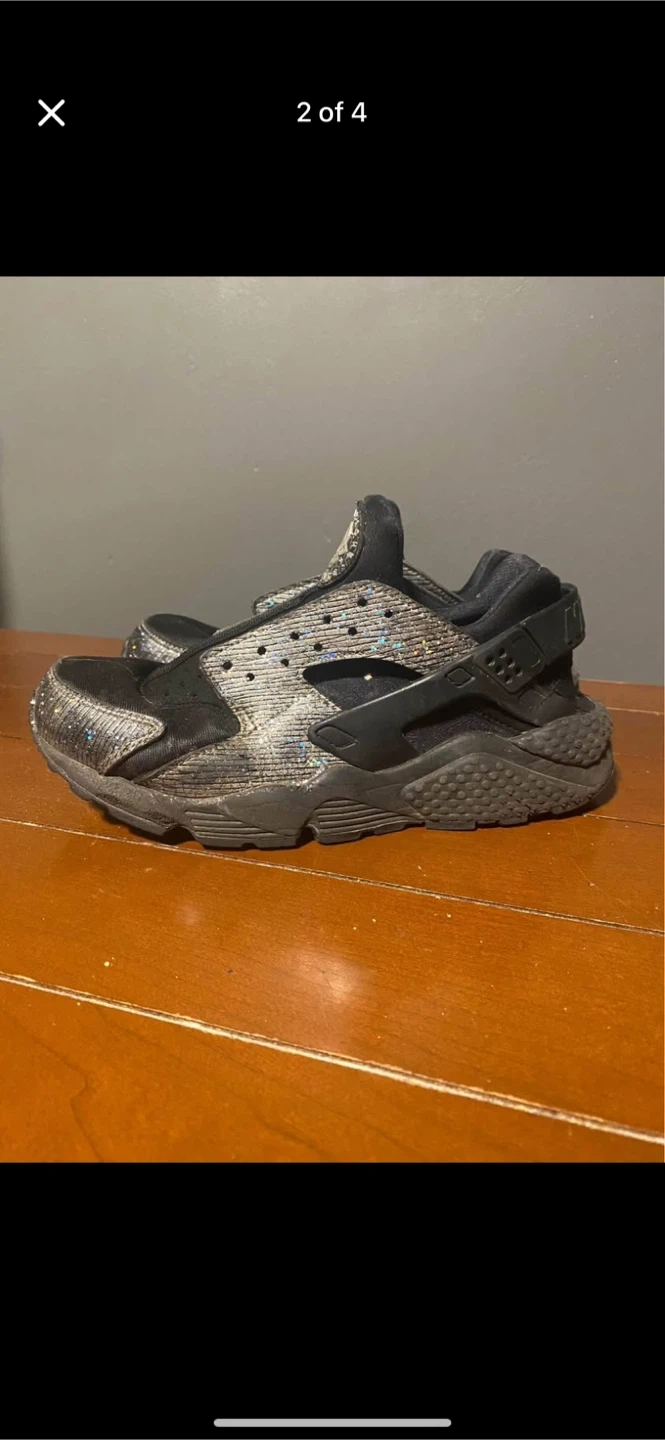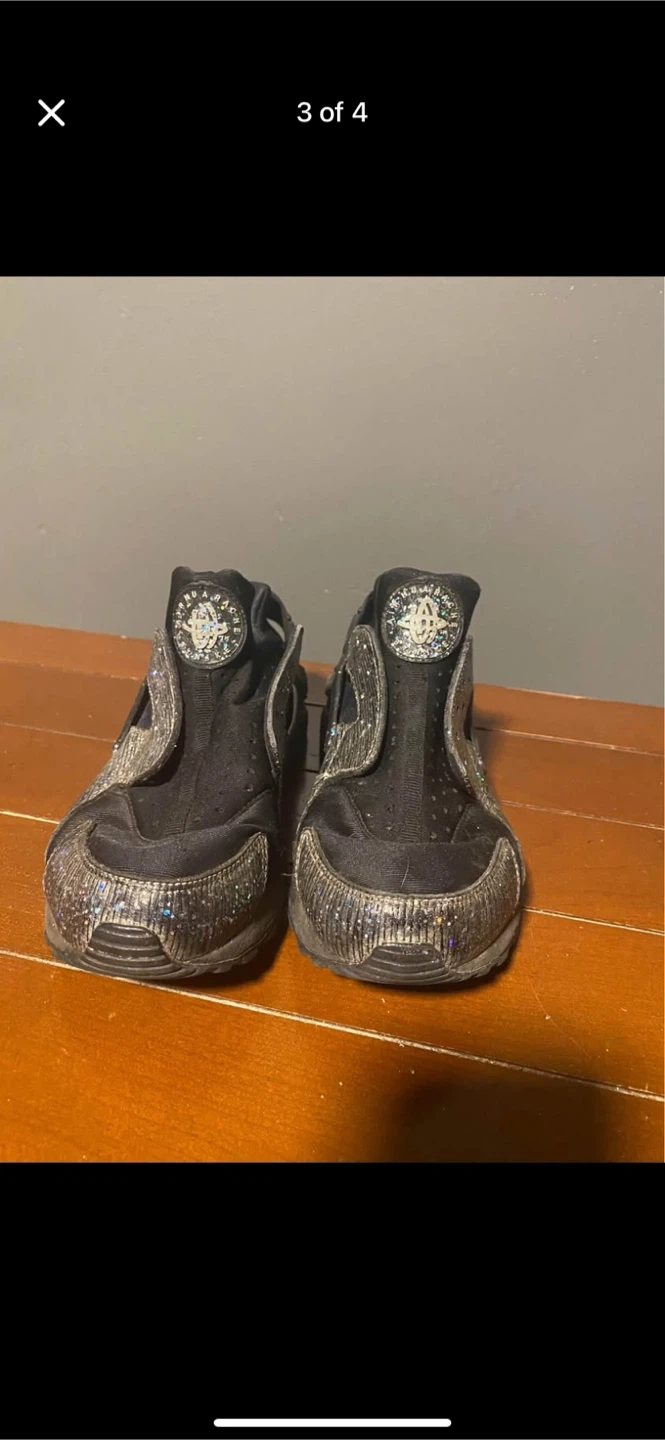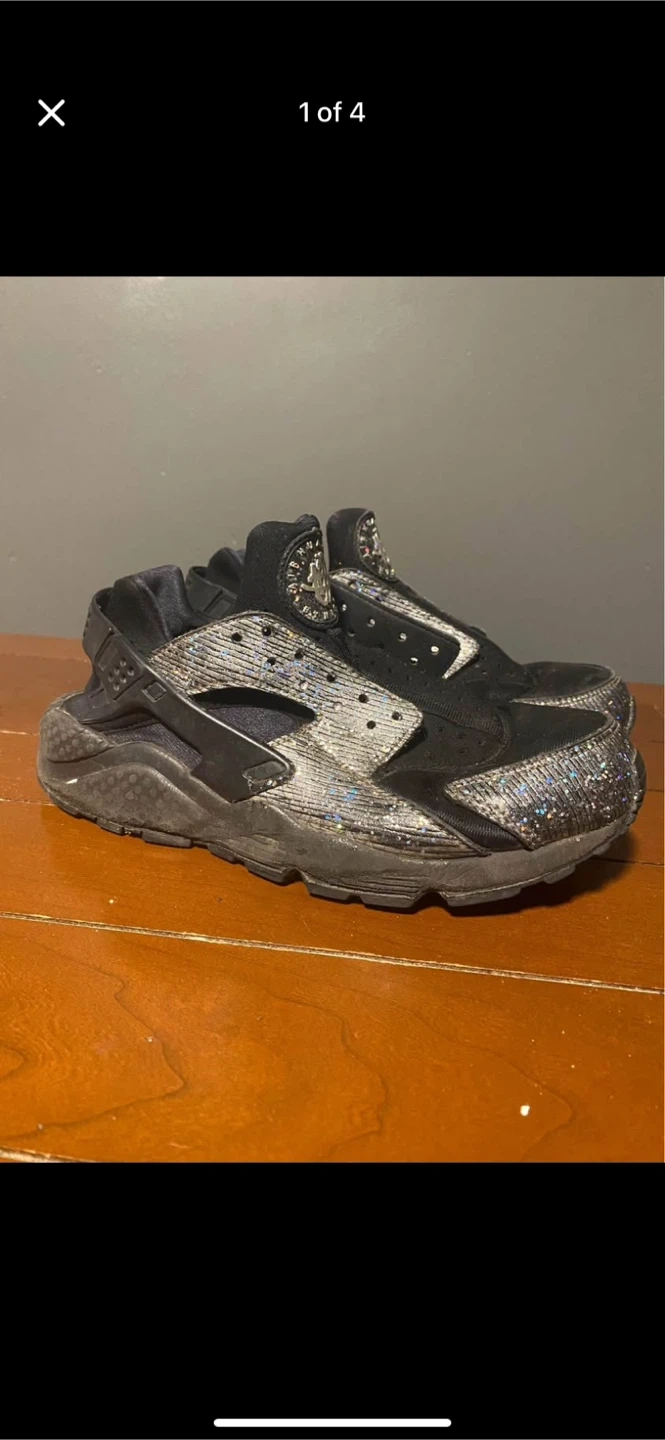 Selling a pair of Nike Huarache Run sneakers that have been customized with bling! They are a US size 7.5 and have a unique, eye-catching design. They do show signs of wear.and are missing laces
