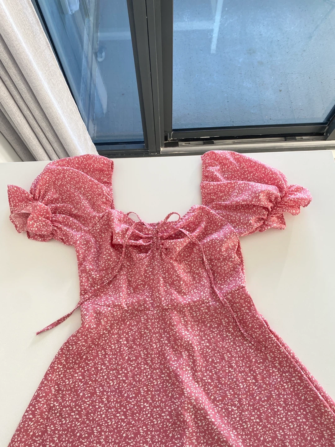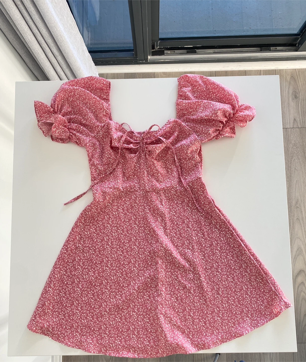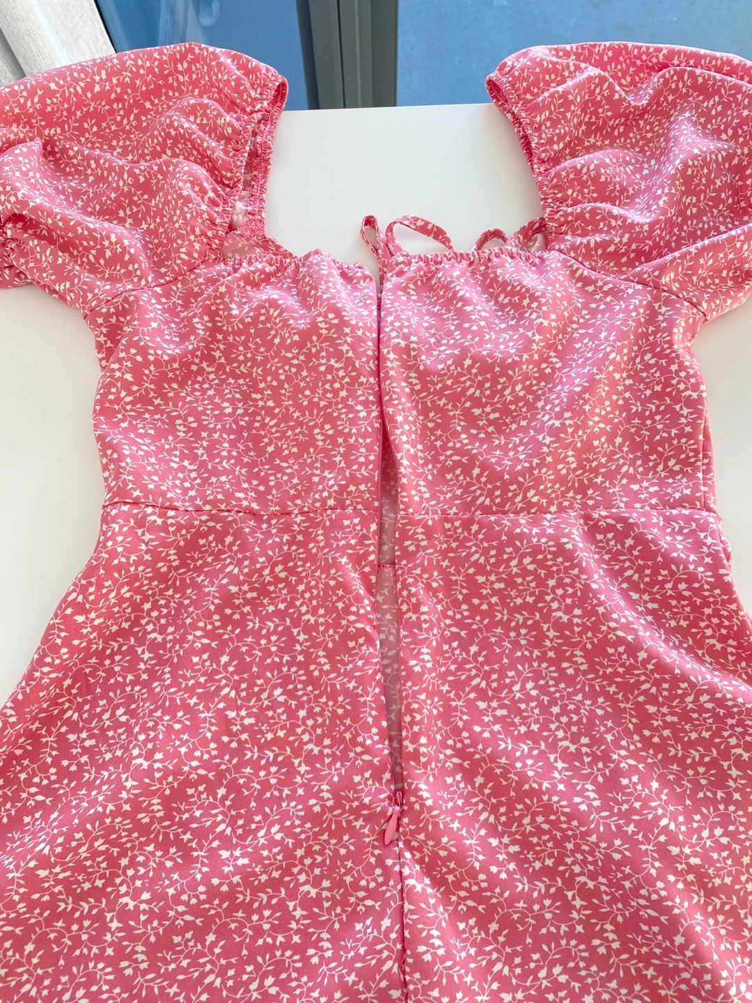 Super cute milkmaid ruched bust dress in pink, size small. Looks very flattering and ruching gives the illusion of fuller bust area. Long zipper at the back for easy wearing and body hugging fit. It's in great condition and perfect for summer!