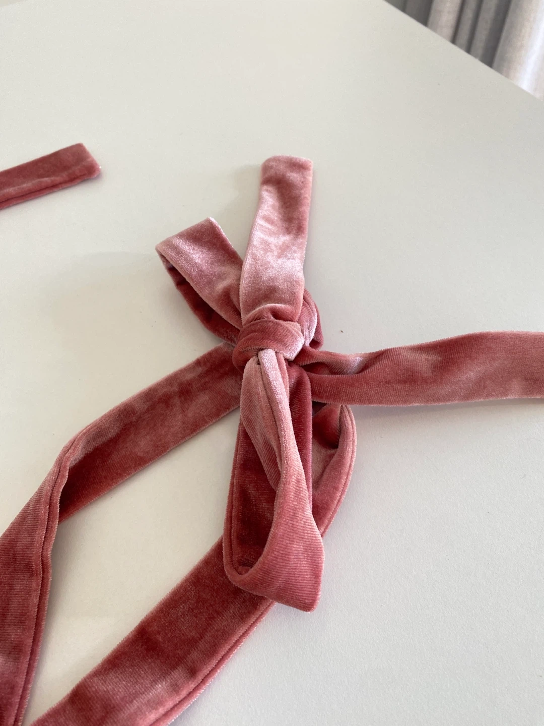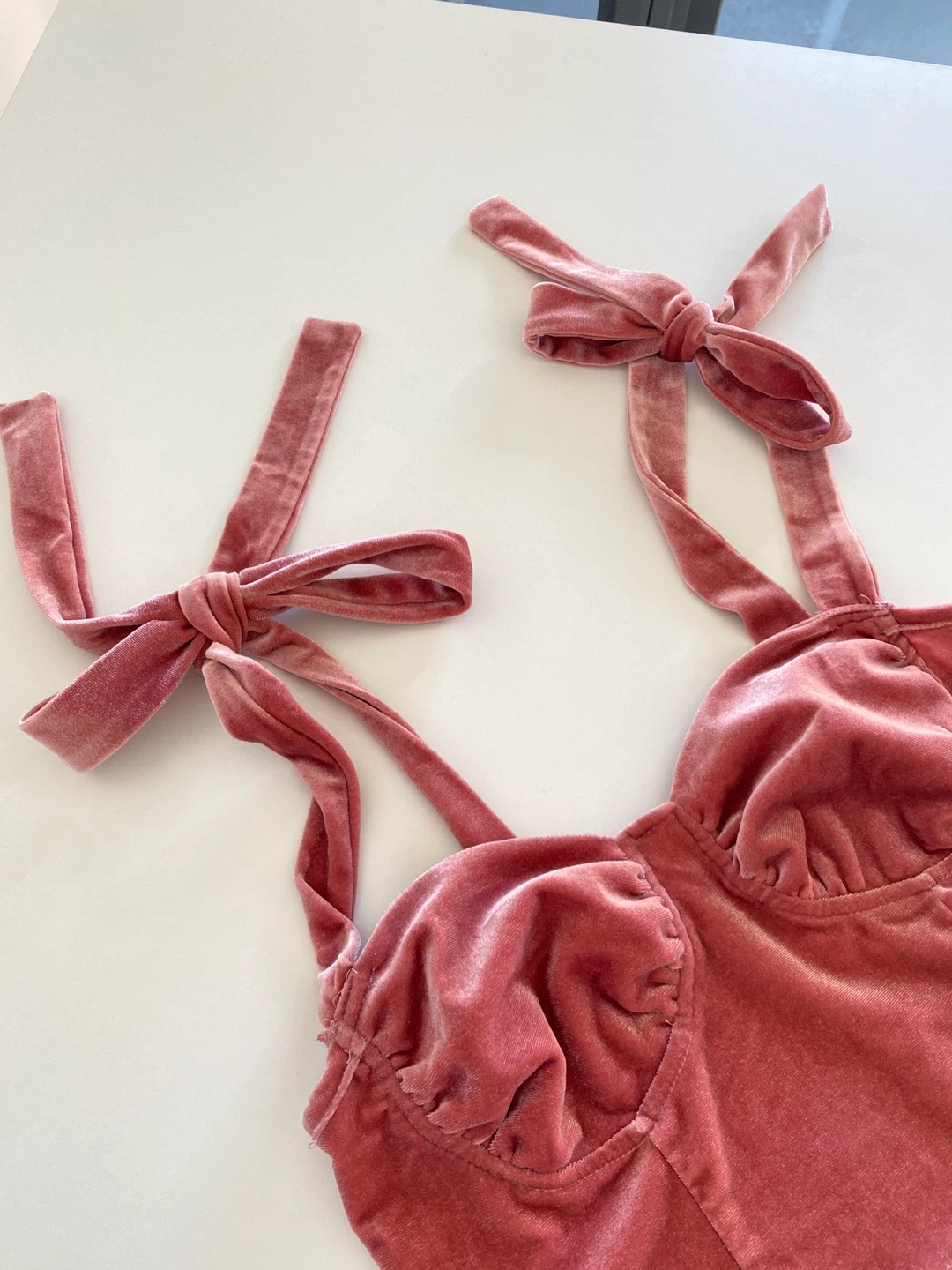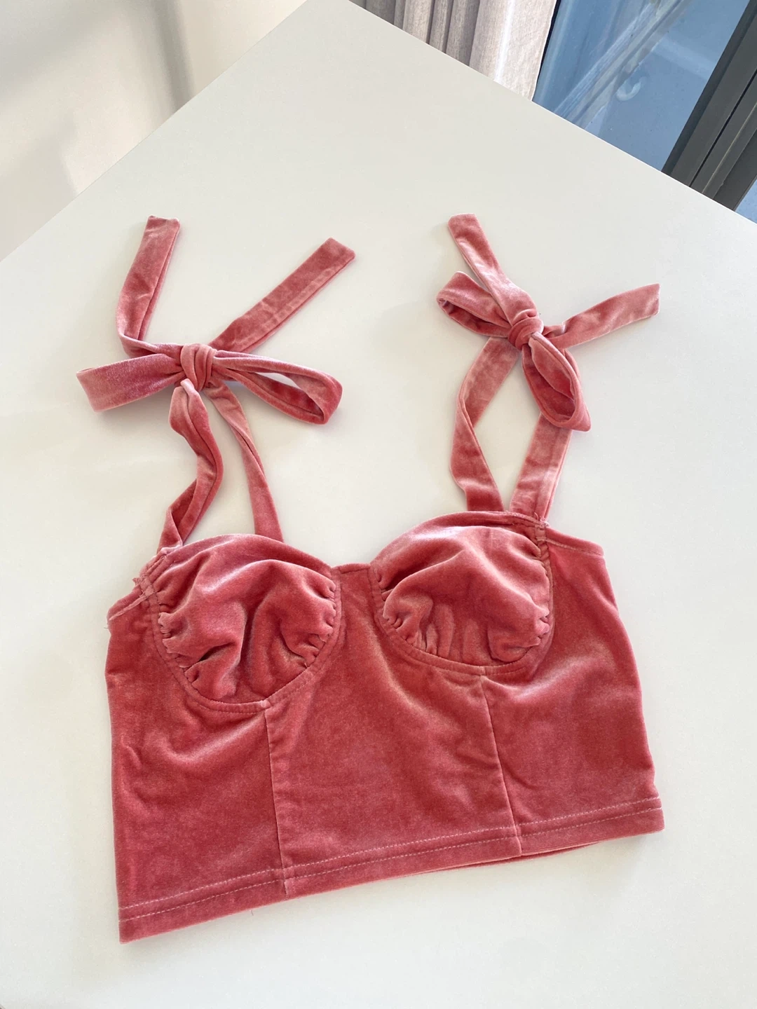 Selling a cute pink velvet bow top! It's in great condition and would be perfect for a night out or a special occasion. The velvet material is soft and luxurious, and the design is flattering.