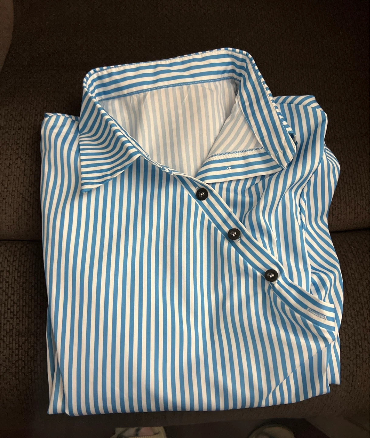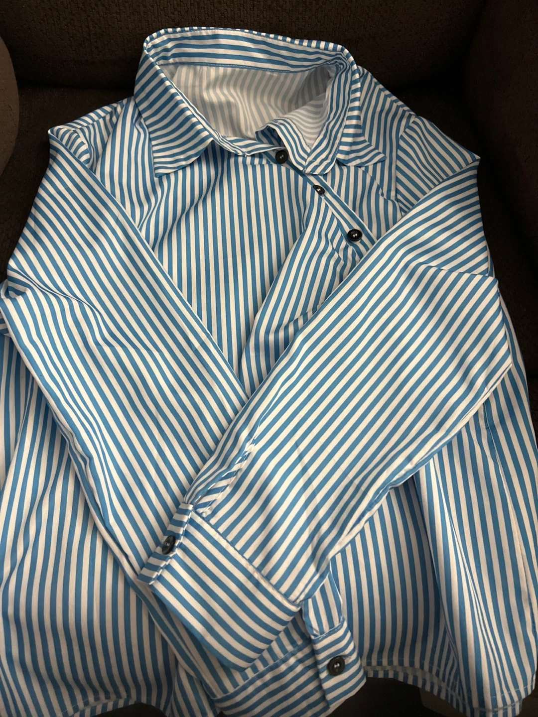 A stylish striped button-up shirt! The shirt features a classic design with blue and white vertical stripes. It's in great condition and ready for a new home!