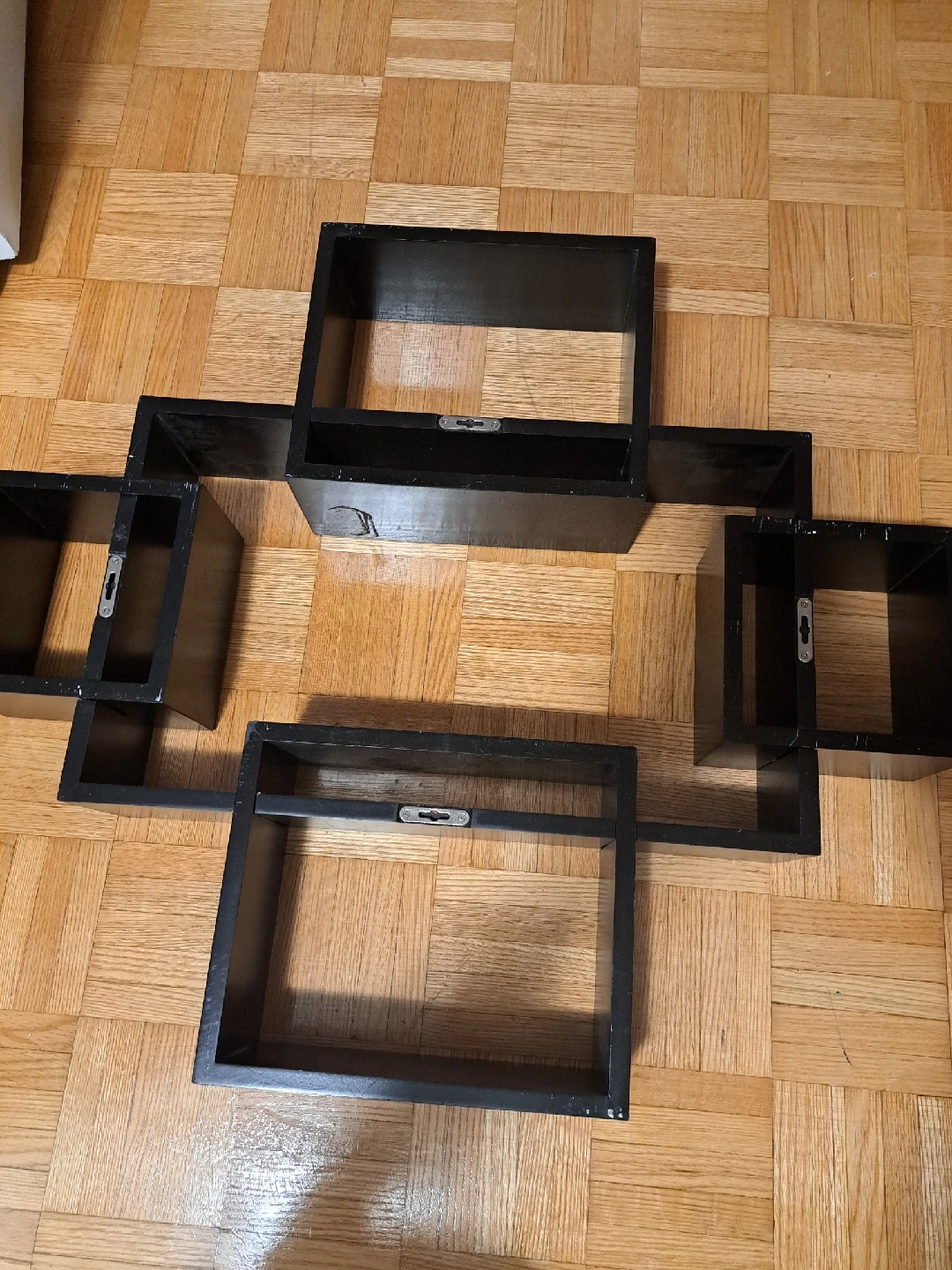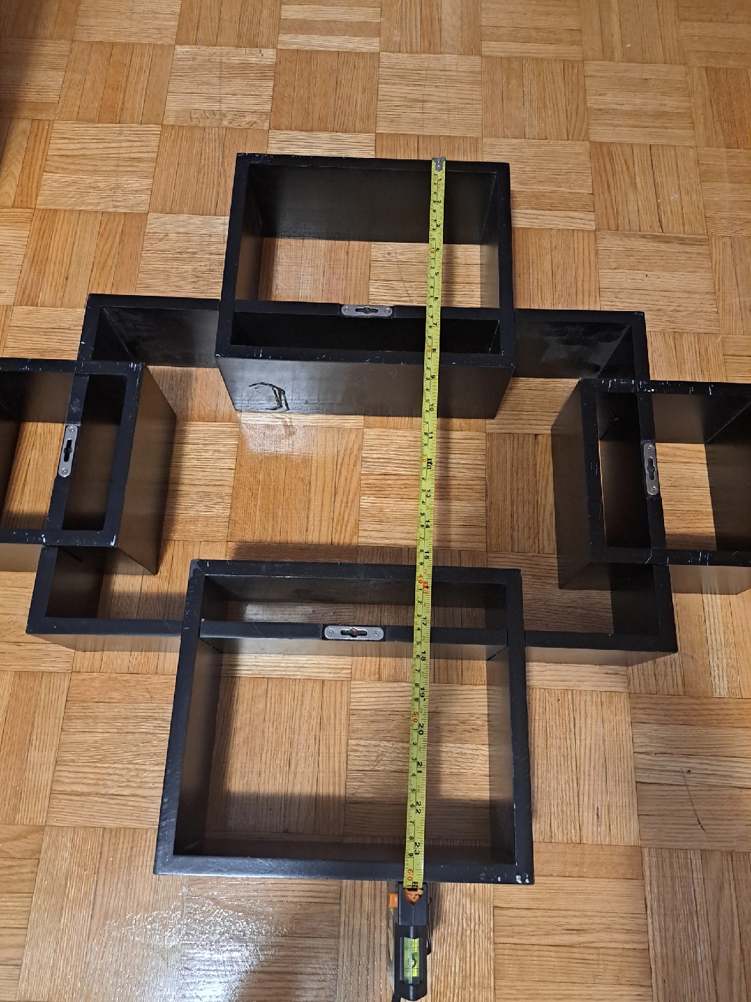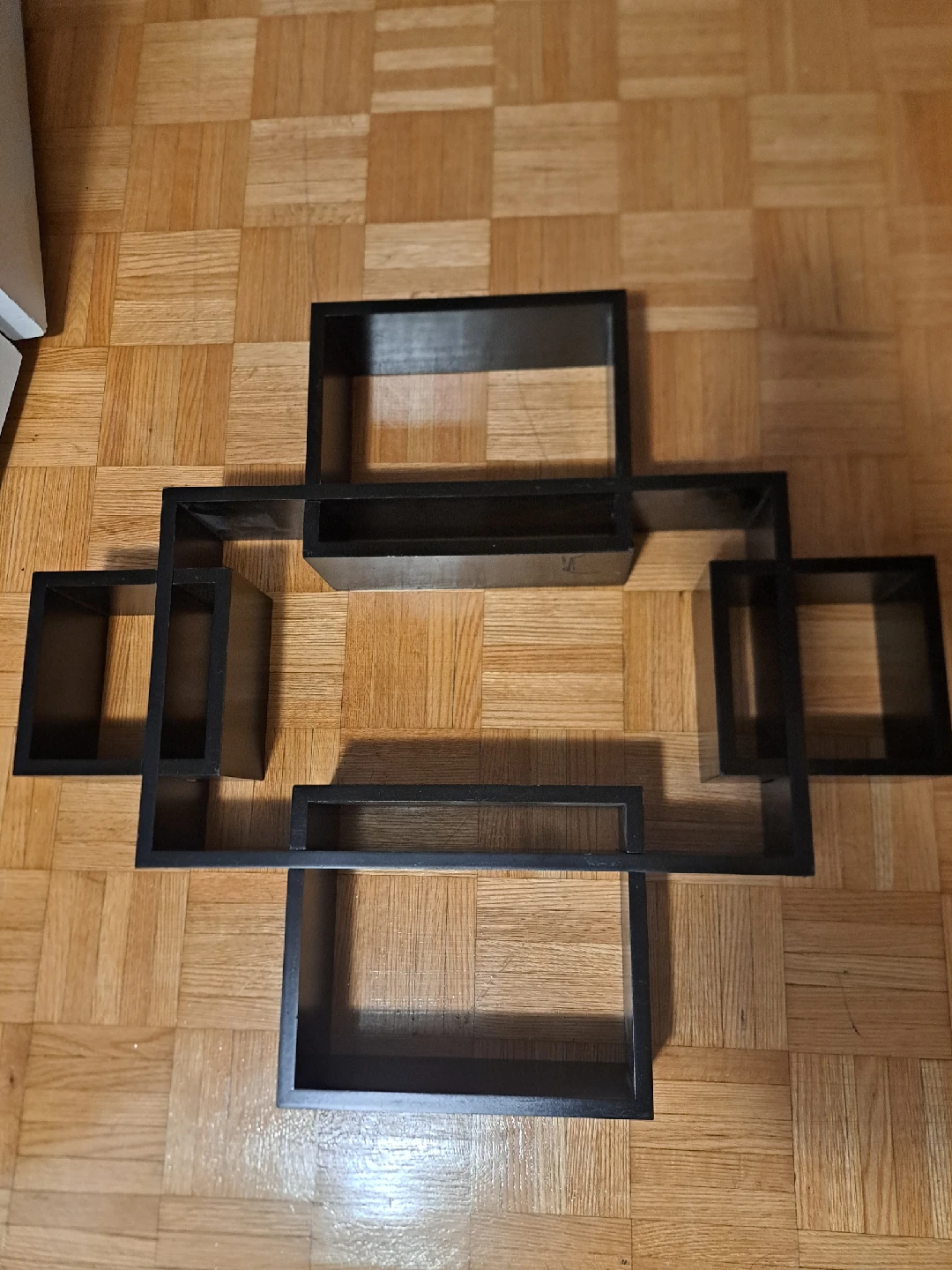Selling a unique black wooden interlocking wall shelf! It's in great condition and ready to add some style to your space. The shelf measures approximately 26 inches in length. Perfect for displaying your favourite items or adding some extra storage