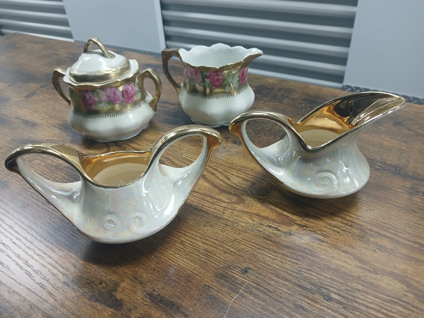 Selling a lovely vintage porcelain creamer and sugar set! The set includes a sugar bowl with a lid, a creamer pitcher with floral design, and two gravy boats with golden trim. Perfect for adding a touch of elegance to your table setting