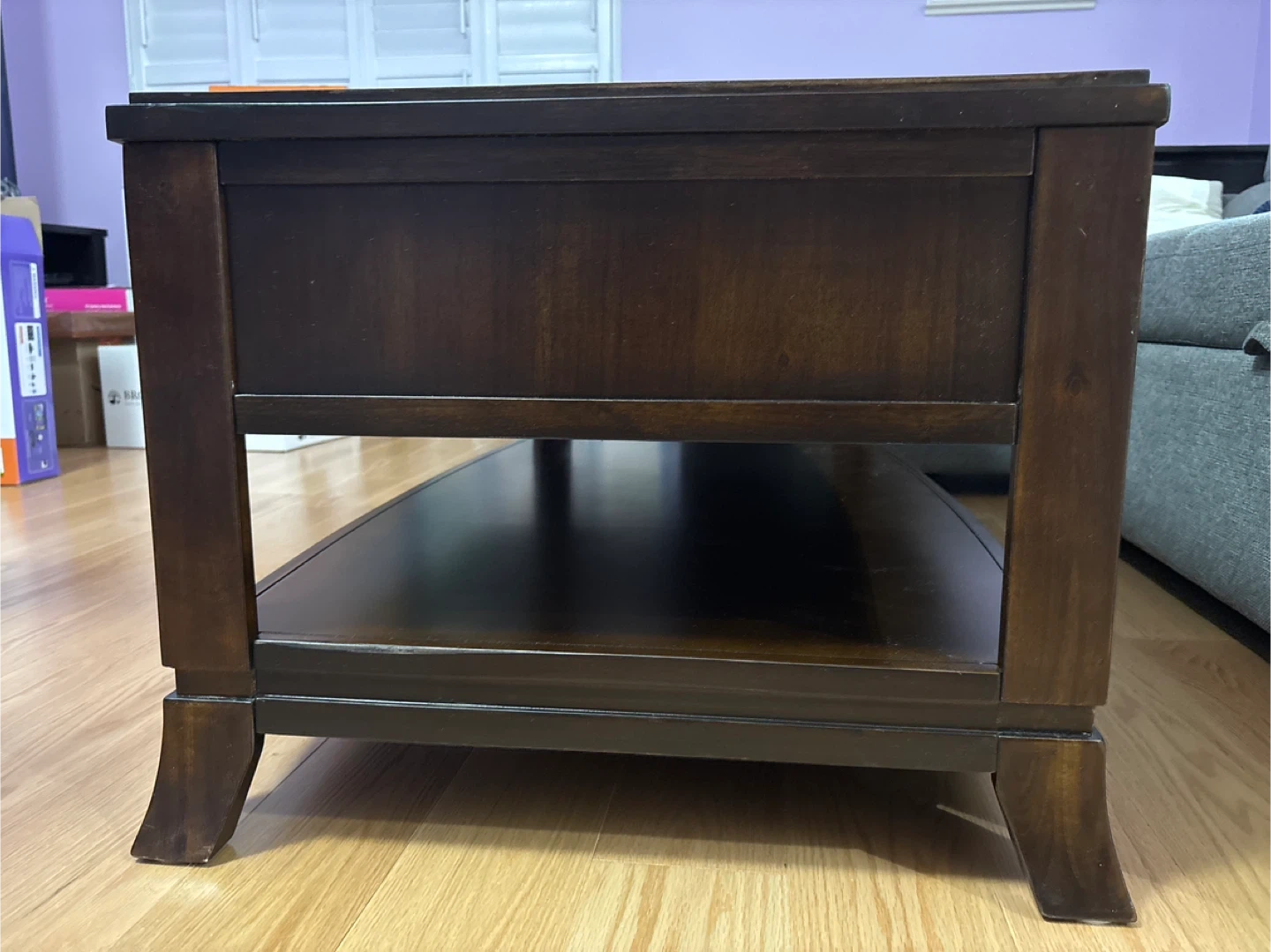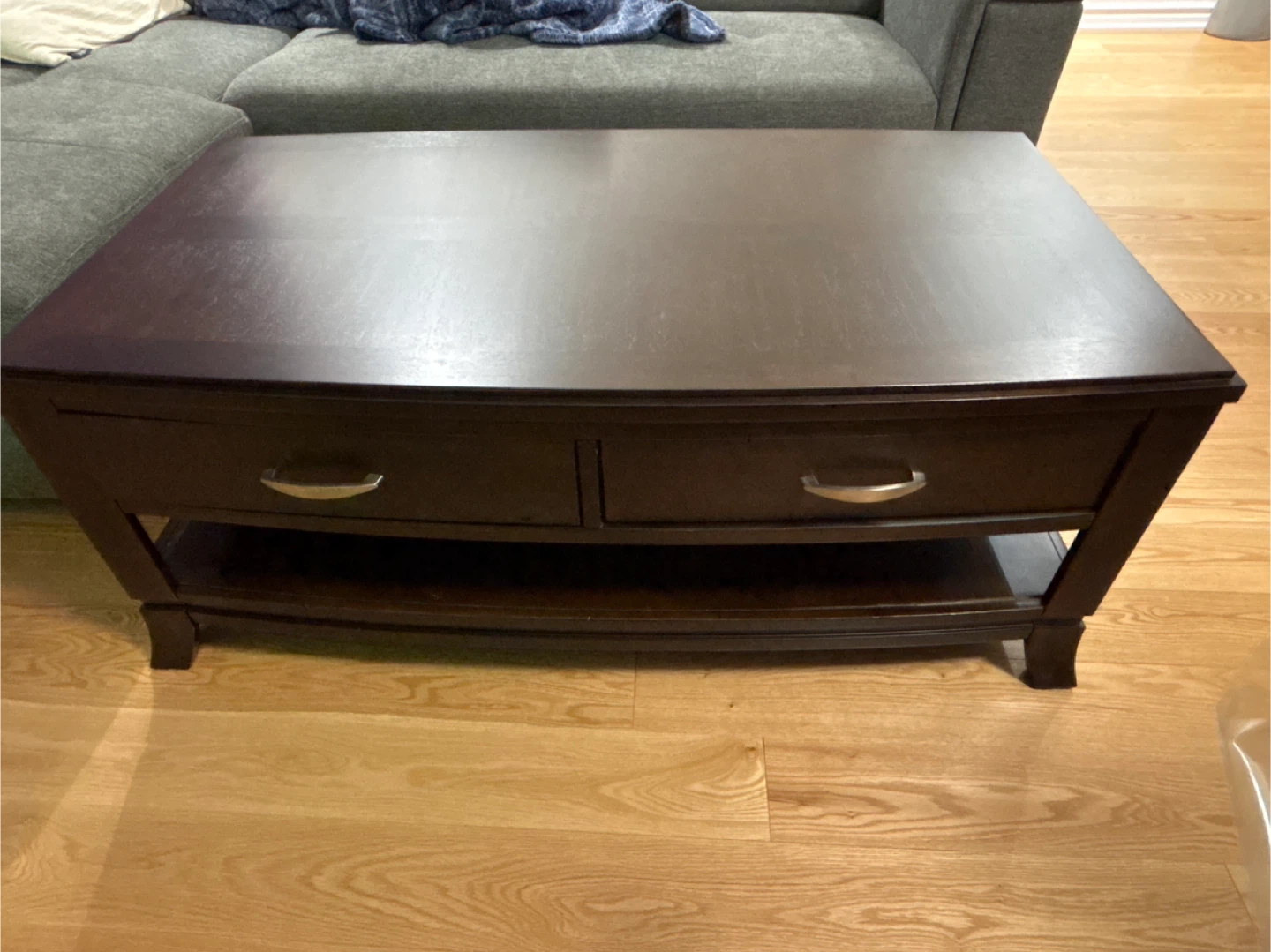 Selling a lovely dark wood coffee table! It features two drawers for storage and a shelf underneath. It's in good condition and would look great in any living room